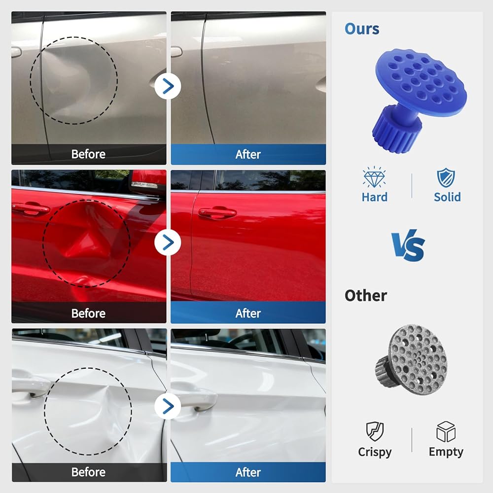 PROFESSIONAL DENT PULLER KIT: Say goodbye to expensive auto body shop repairs - take care of it yourself! Our dent puller kit contains all tools needed to car dent repair, and can be used unlims dents through strong sticky hot melt glue, and hot melt glue is easy to remove without damaging the paint. Whether you are a novice or a professional, you can easily complete the car dent repair workited times. The bottom of the paintless dent removal kit is made of rubber and will not damage the original paint