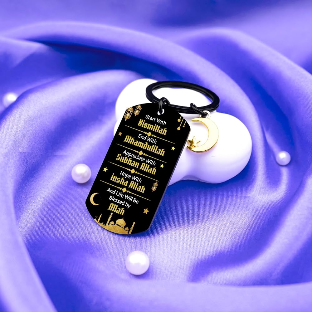 Embrace the spirit of mindfulness and faith with this beautifully engraved Islamic Keychain. Designed to offer daily inspiration, it features a powerful sequence of reminders that guide the heart and mind: Start With Bismillah, End With Alhamdulillah, Appreciate With Subhan Allah, Hope With Insha Allah, And Life Will Be Blessed by Allah. This keychain is more than an accessory; it's a personal companion for spiritual reflection, making it a deeply meaningful Islamic gift.