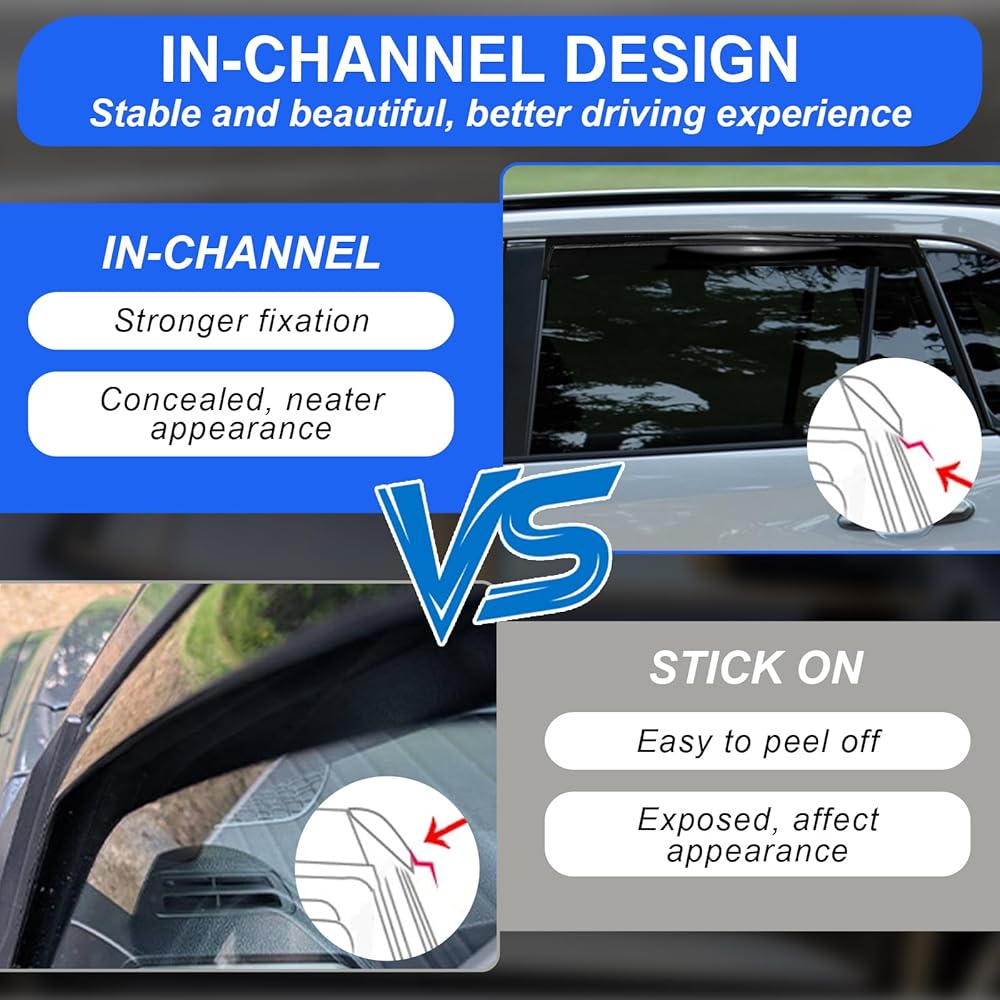 【Quick, No-Drill Installation】Utilizes strong, automotive-grade 3M adhesive tape for a secure, permanent hold. The in-channel design simply presses into your window channels—no tools, no drilling, and no damage to your vehicle. Installation takes just minutes.