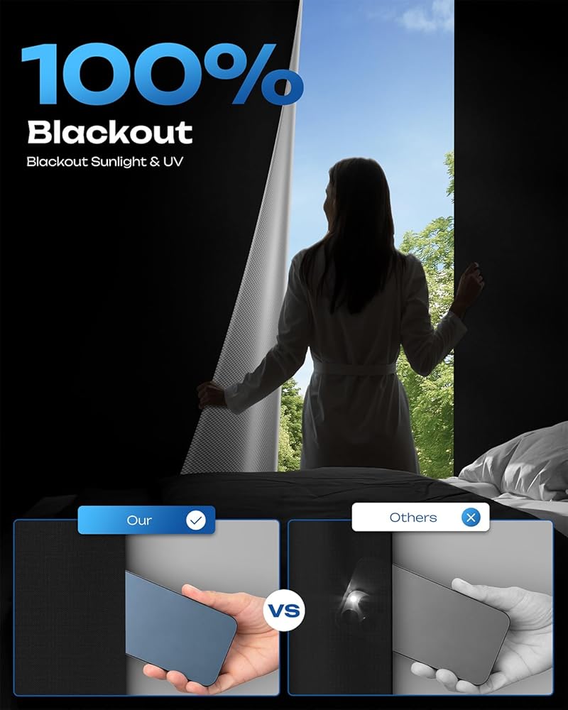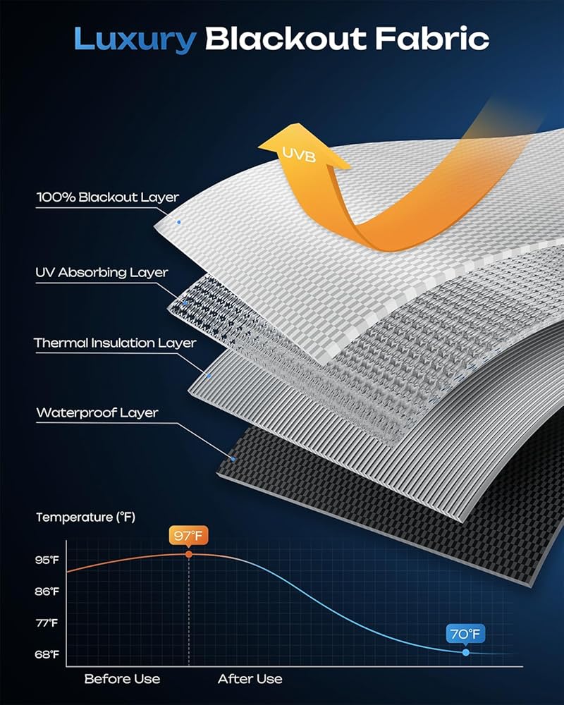 【100% Blackout】:LEIYER 100% blackout window cover is engineered with triple-layer blackout material to completely block sunlight and UV rays. Made of polyester with silver-coated backing, the portable blackout curtains reflects 99% of heat radiation