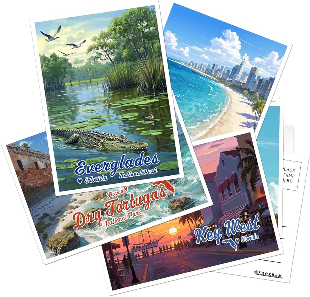 PACKAGE CONTENTS: A set of 24 high-quality postcards showcasing 8 unique landmarks or traditions in Florida, with 3 copies of each design for sharing or collecting.
