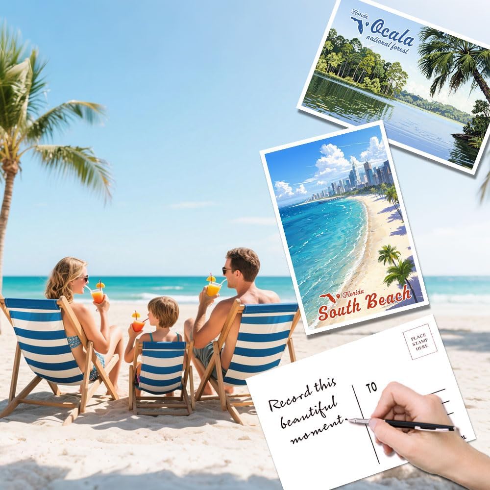 RETRO DESIGN: Features a vintage-inspired design with classic poster-style illustrations capturing Florida's most famous attractions, making each postcard a piece of history.