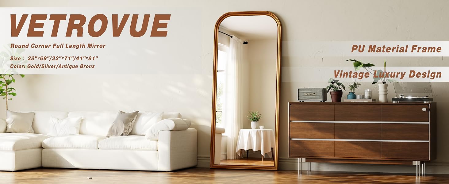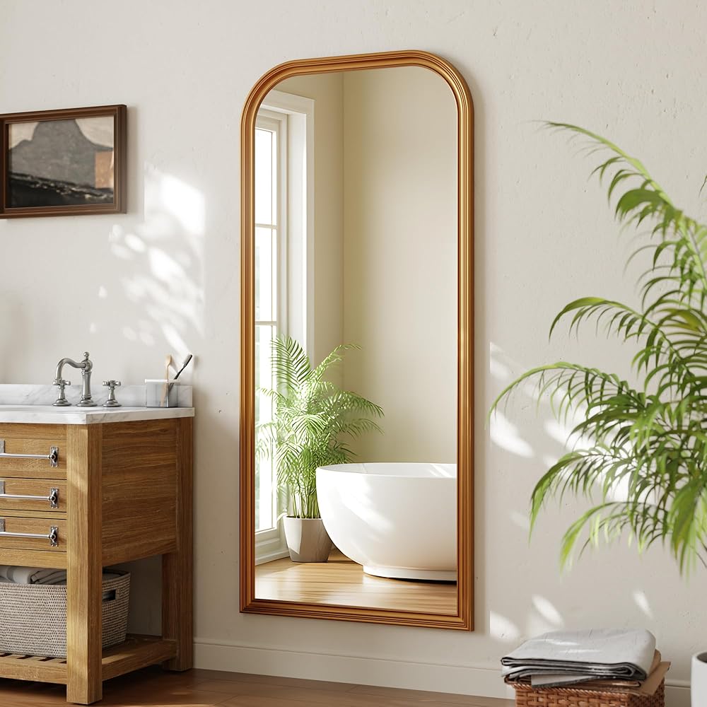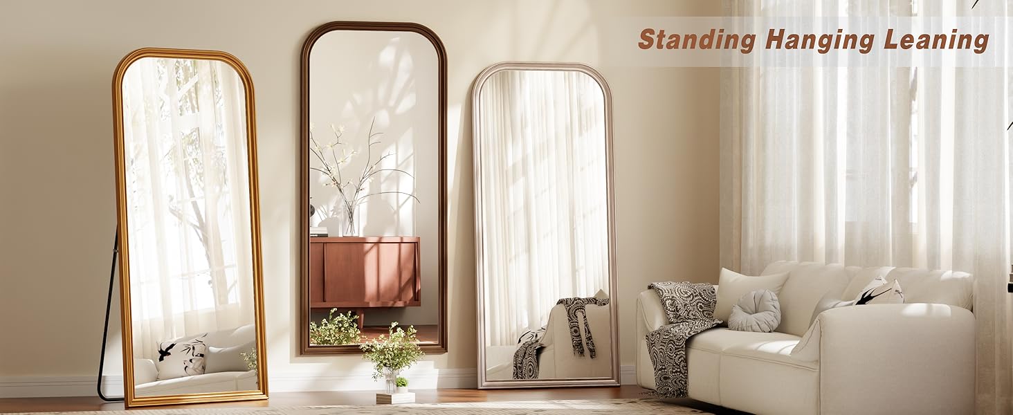 Rounded-Top Arched Design: This arch full length mirror features a timeless rounded-top silhouette with a sleek, layered frame in your choice of Gold, Bronze, or Silver. It channels vintage glamour and classic elegance, making it the perfect statement piece for bedrooms, living rooms, entryways, boutique hotels, cozy coffee shops, or vintage-inspired dressing rooms. The curved top adds delicate charm while elevating any classic, retro, or Hollywood Regency aesthetic