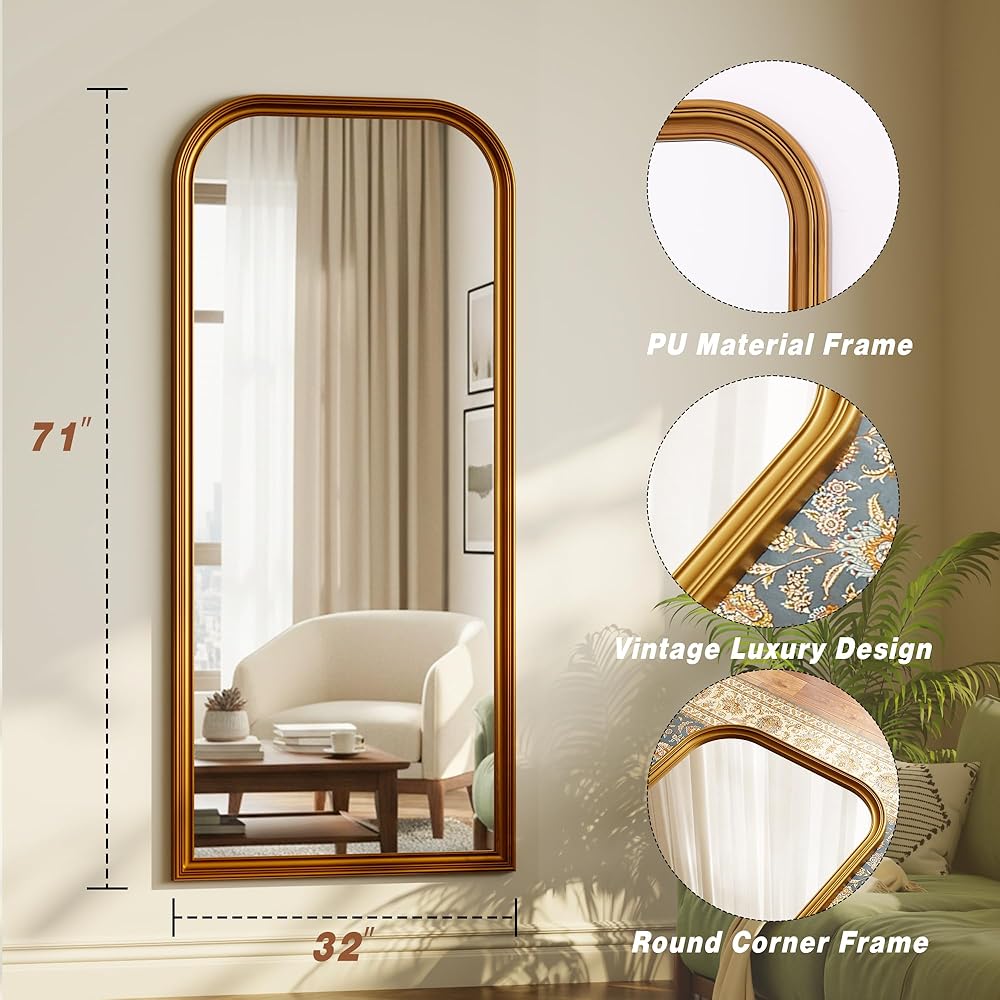 Premium PU Frame: Crafted with a sophisticated, decorative PU frame, this arched full length mirror combines style and practicality—its smooth, layered finish is easy to wipe clean for daily maintenance. The rich gold hue exudes opulent charm, perfectly suited for glamorous decor or Hollywood Regency style. It's a stunning addition to glam or mid-century modern rooms, infusing spaces with warm, luxurious warmth that elevates any decor scheme, making it a versatile focal point for rooms