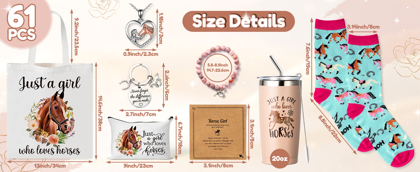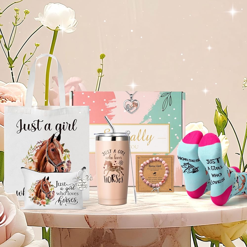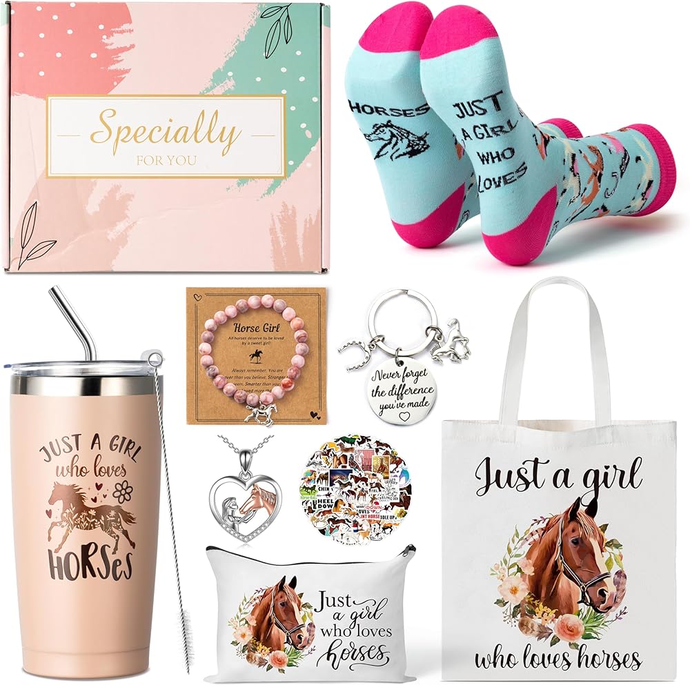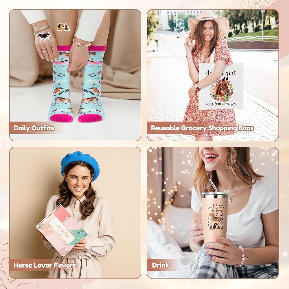 Complete Horse Lover Gift: This all-in-one bundle includes a themed tote bag, thermos, bracelet, necklace, socks, keychain, and 50 stickers, making it the ultimate horse lover gift set for birthdays, holidays, or special surprises. Perfect for young equestrians, horse camp, or as a themed party favor.