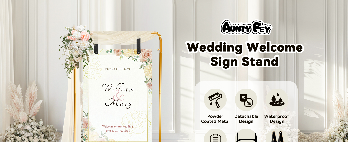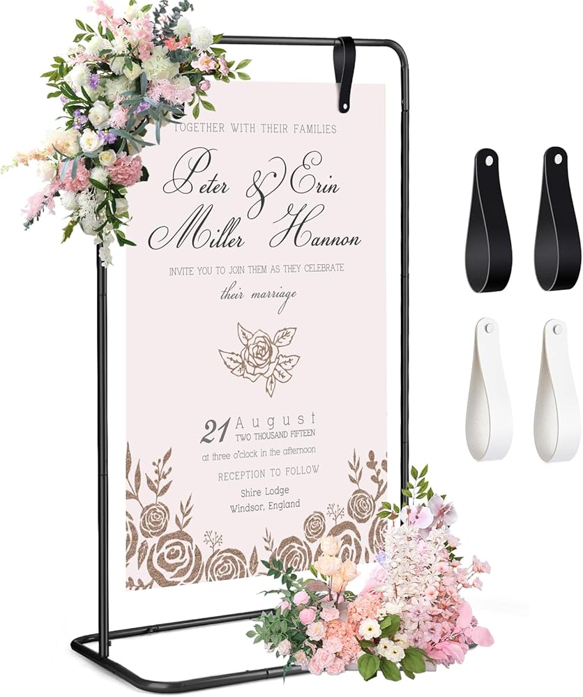 4 Hanging Straps(6 inch):Included with the frame are 2 white and black PU leather straps, specially designed for hanging wedding welcome signs, banners, or lightweight decor on your hanging sign stand. Crafted from high-quality PU leather, can fixed thickness not exceeding 0.4 pounds wedding sign, welcome signs, seating charts, or floral wreaths (recommended weight limit: 5 lb.). The neutral color palette contrasts beautifully with the gold wedding sign holder.