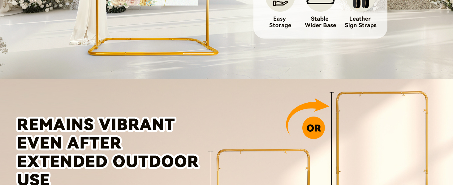 Golden Iron Square Frame:Crafted from iron and coated in a premium rust-resistant golden layer, this gold metal stand—30 inches long and 20 inches wide—provides two height options: 50 inches or 65 inches. Perfect for displaying your "welcome to our wedding sign", it serves as a versatile gold wedding stand(Excluding physical signage). The sleek square design offers a modern alternative to traditional arches, making it a focal point for both indoor venues and outdoor gardens.