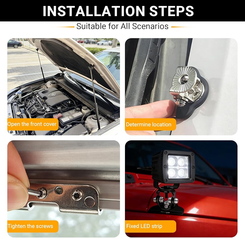 Non-destructive Installation: With these LED hood light brackets, you can add more lights to your machine without drilling or modifications. Simply open the front cover, locate the mounting position, tighten the three bottom screws, and then secure the light strip to the bracket. Ensure a secure installation to prevent bulb movement and improve vehicle lighting.