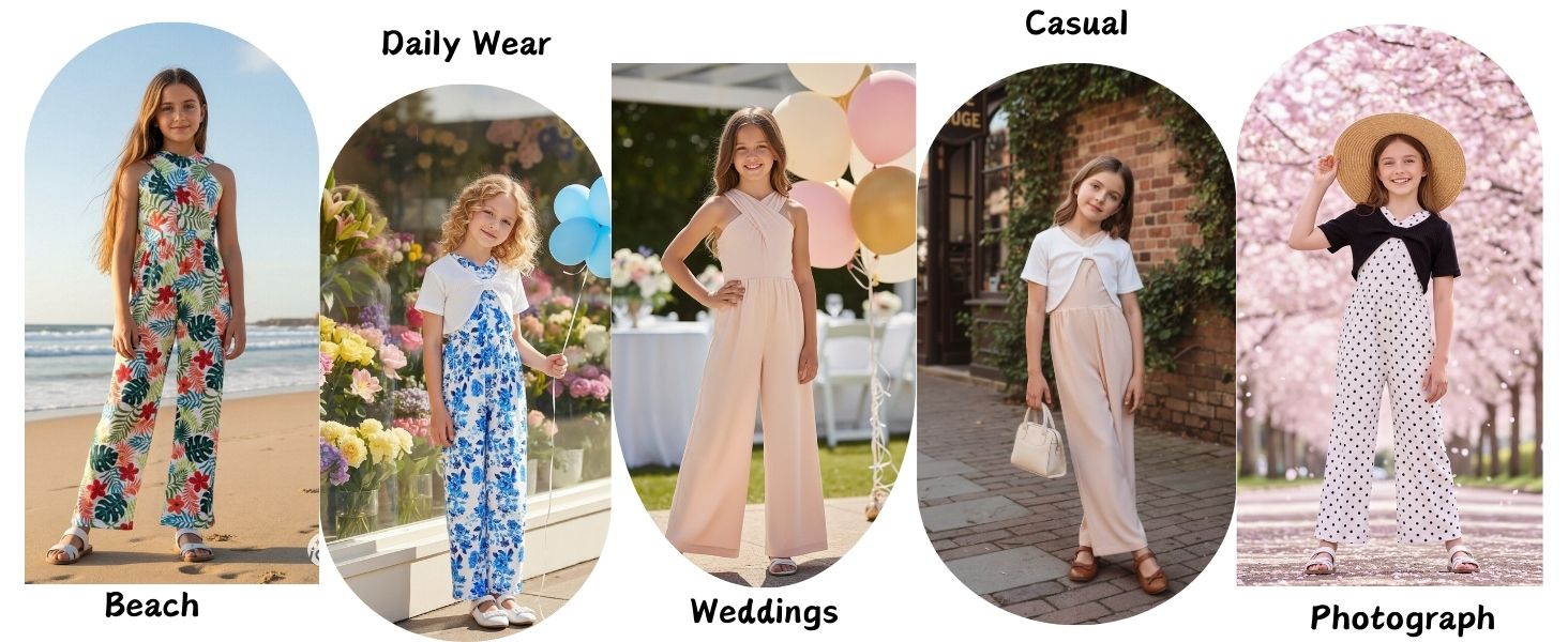 Essential Clothing for Summer: Trendy jumpsuit can be designed to different style, it printed with floral, tropical style, polka dot and solid color. And it is prefect for party, birthday gift, school, weddings, school graduation, daily wear, beach, photoshoot outfit, etc. It can be paired with some accessories to complete the fashion look and make your girls more eye-catching!