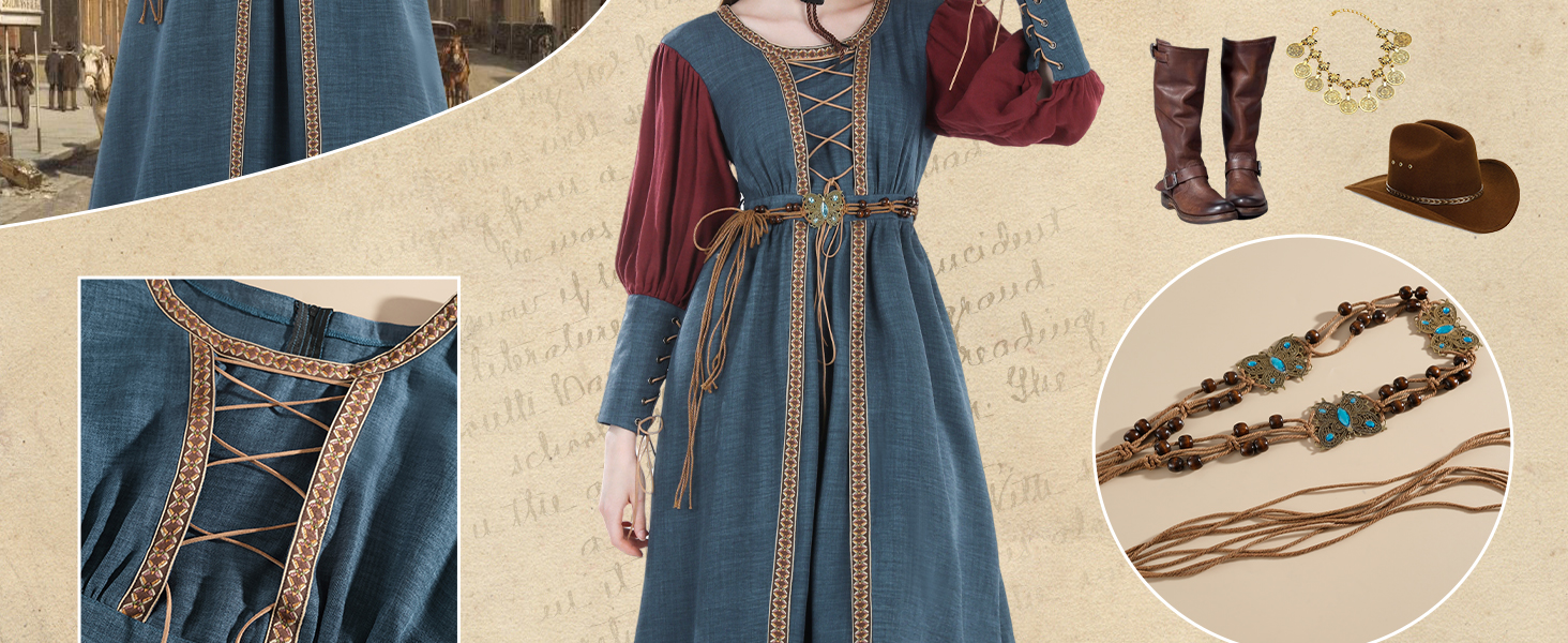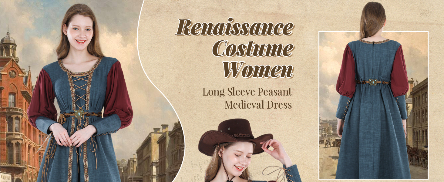 【Package】This womens medieval costume includes one blue dress and one butterfly belt. The medieval dress is a round neckline with a brown vintage print on the front. This medieval outfit is double layered at the hem with classic ruffles for a flowy and elegant look