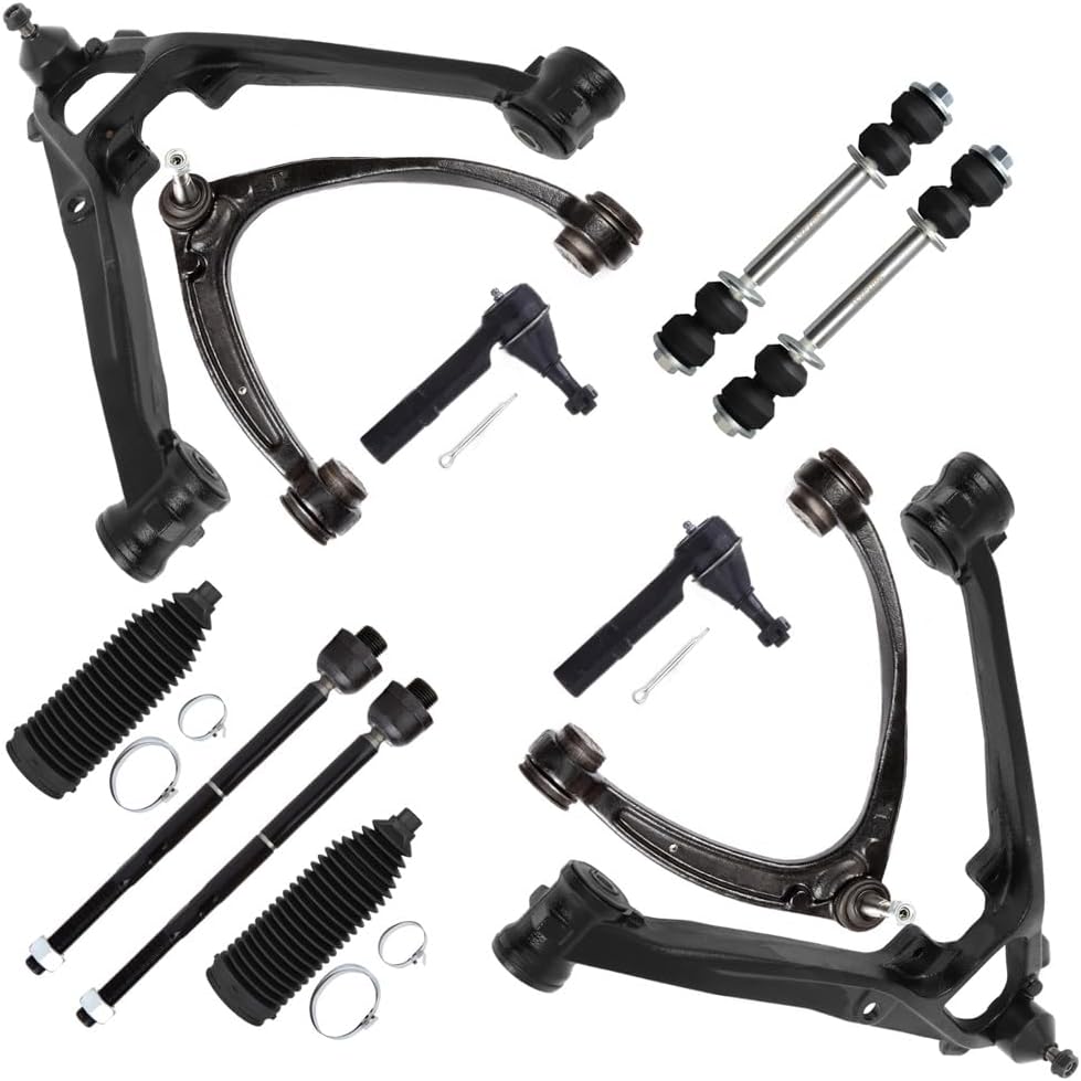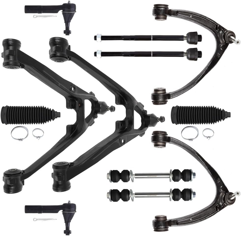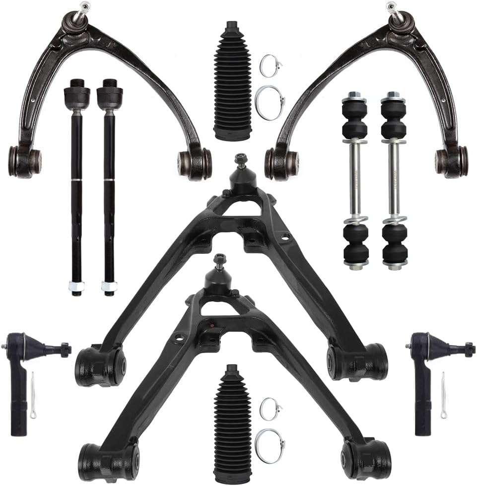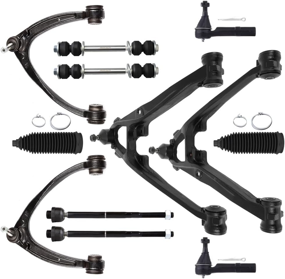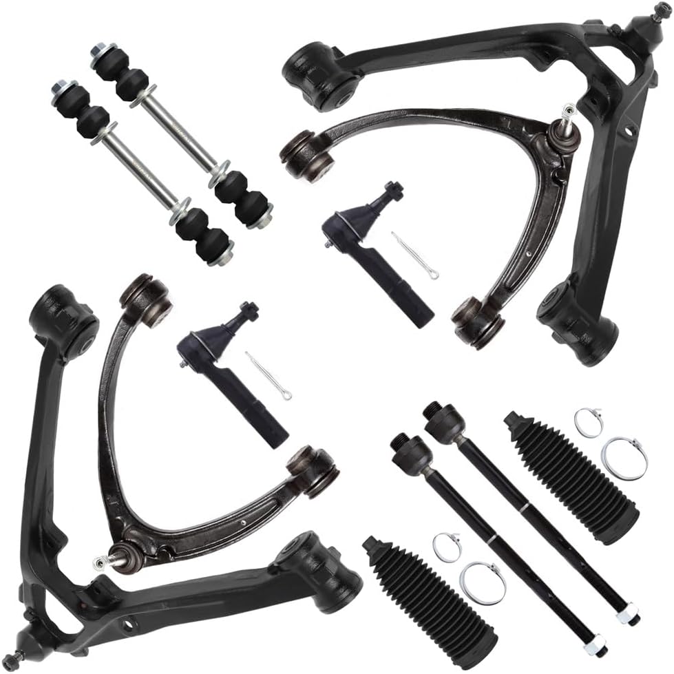 Package Content: 1 X Front Upper Control Arm And Ball Joint - Driver Side, 1 X Front Upper Control Arm And Ball Joint - Passenger Side, 1 X Front Lower Control Arm And Ball Joint - Driver Side, 1 X Front Lower Control Arm And Ball Joint - Passenger Side, 2 X Front Outer Tie Rod End, 2 X Front Inner Tie Rod End, 2 X Front Sway Bar End Link, 2 X Front Steering Rack Boot