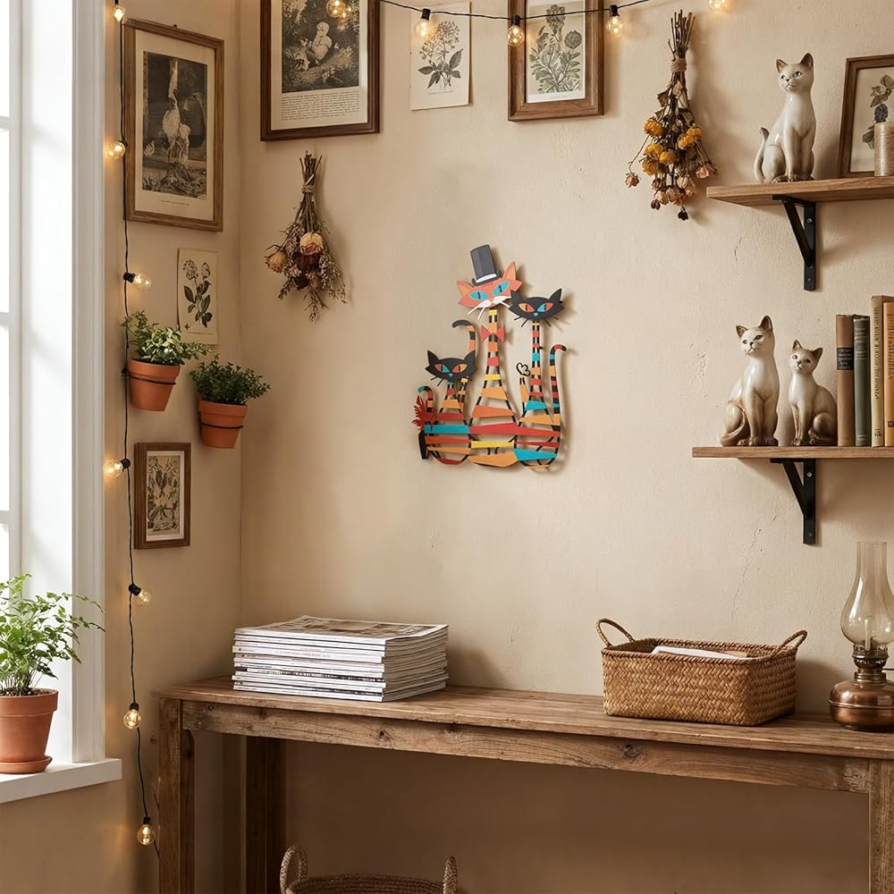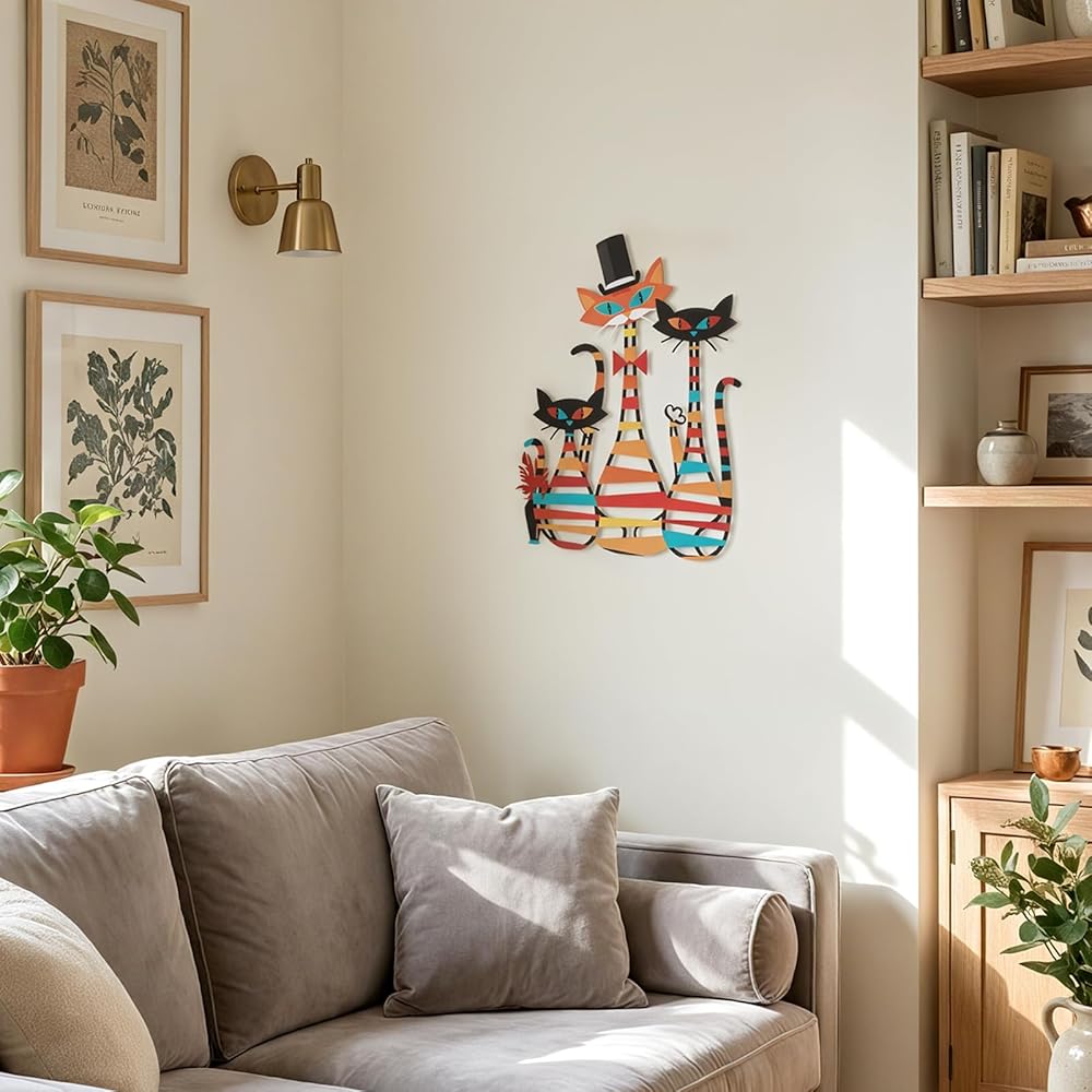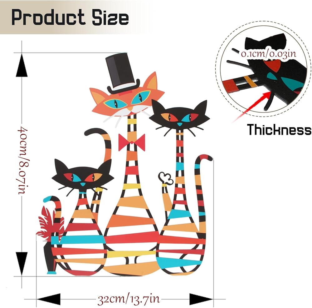 DIMENSIONS: Large metal wall art measuring 15.5 x 12.2 inches, featuring three artistic cat silhouettes in a modern design