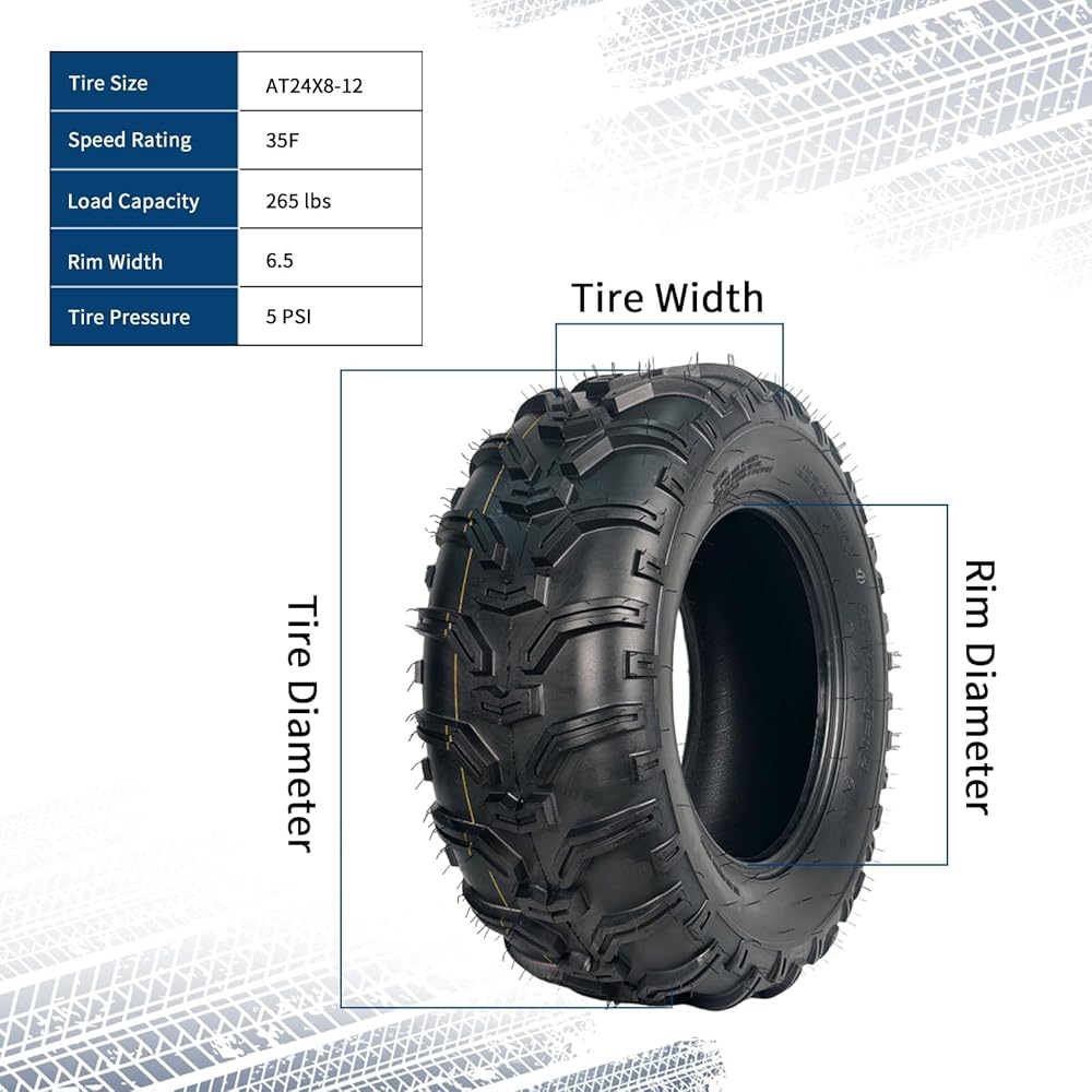 Built for comfort and versatility, these all terrain tires feature flexible sidewalls and advanced patterns that absorb impacts for a smoother ride with less fatigue. Compatible with most ATVs, UTVs, quads, and golf carts, they're the ideal replacement for 24x8x12 ATV tires—perfect for anyone who demands superior handling and long-lasting performance on every adventure.