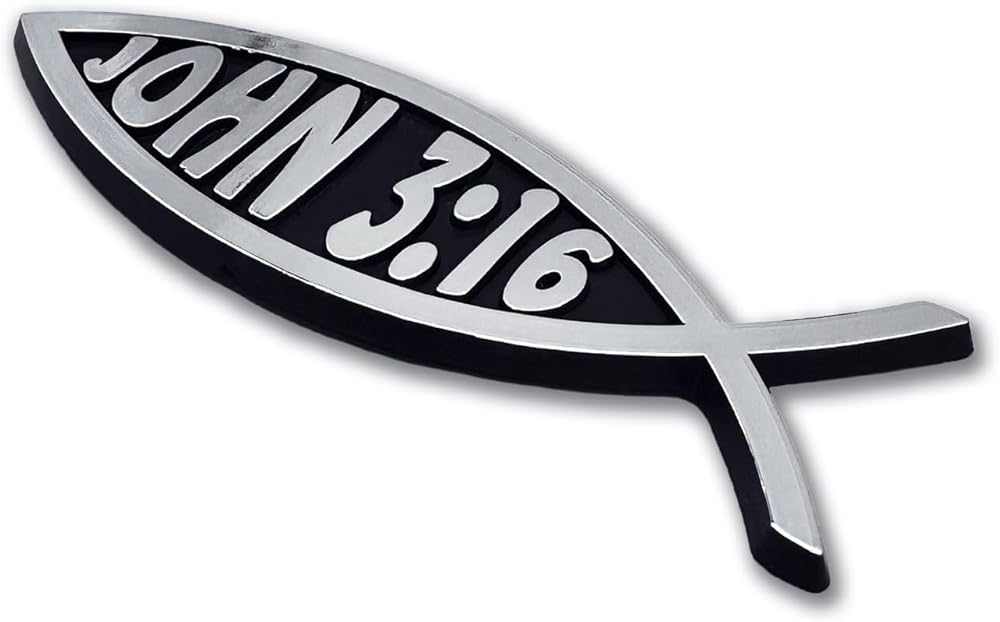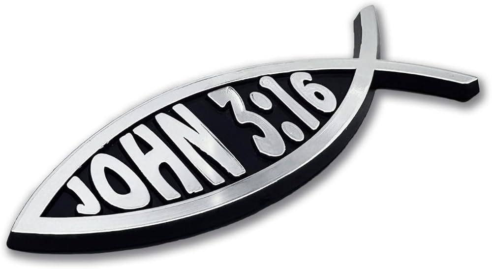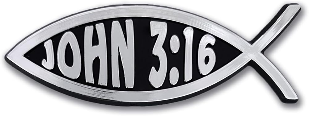 Proudly display your faith with this John 3:16 Bible verse Christian fish auto emblem (1.4” x 4.0” x 0.2") by NJECT. This emblem is custom molded in black ABS plastic with bright chrome color hot stamp surface. Made in North America, the durable automotive-grade materials will last for years on your vehicle. Attaches via simple peel and stick, paint-safe adhesive foam tape. Our premium auto emblems are the perfect way to showcase your faith everywhere you drive. In addition, all NJECT auto emblems make a great gift. Our motto is "Inject Style, Drive Bold."