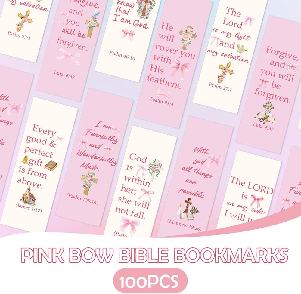 100 Pcs Christian Bookmarks, Religious Pink Bow Cross Flower Paper Bookmark Bulk for Women, Inspirational Bible Verse Book Mark Gift for Reading Lovers Church Accessories