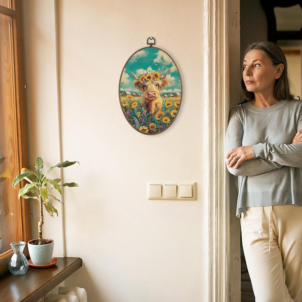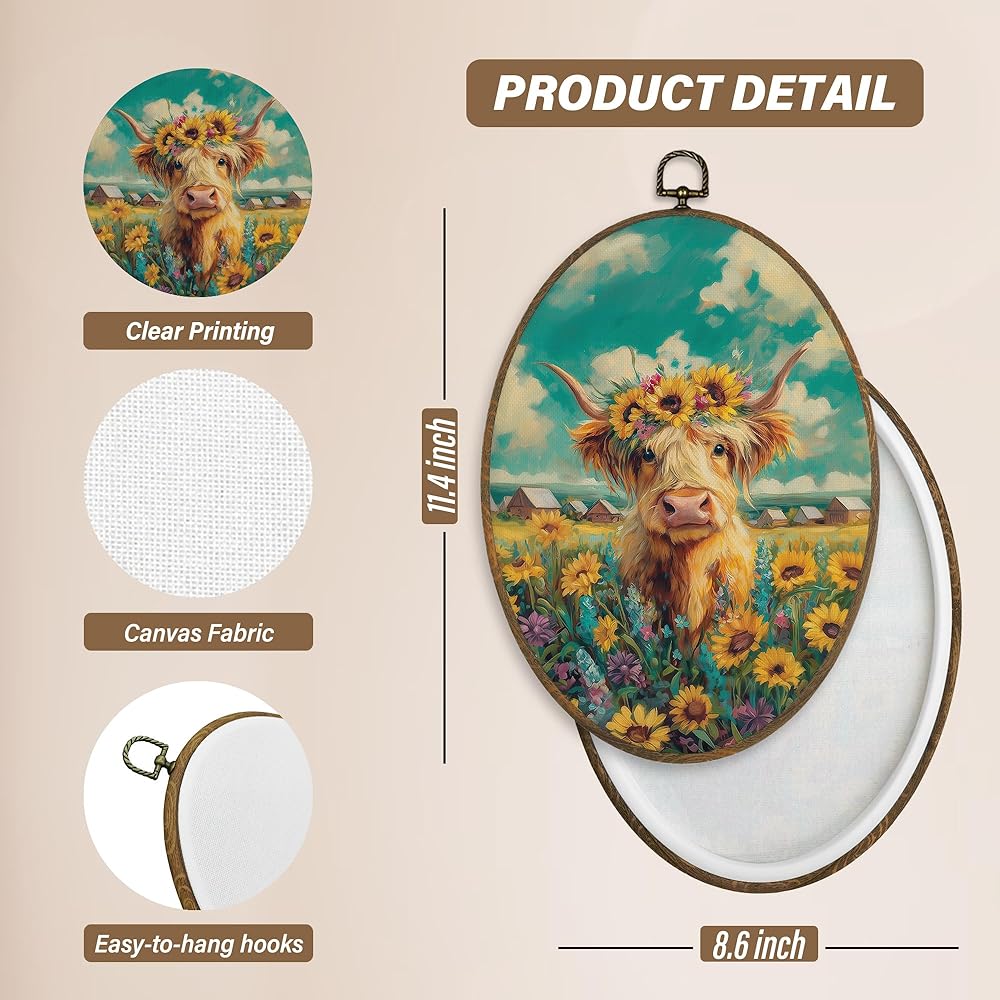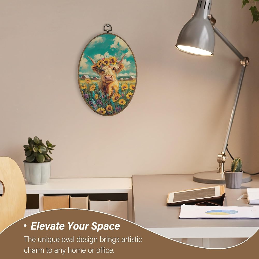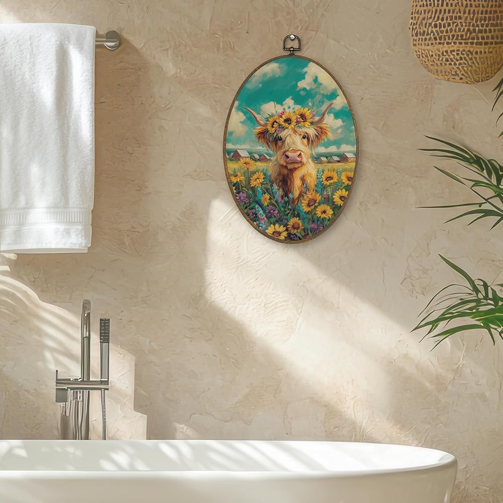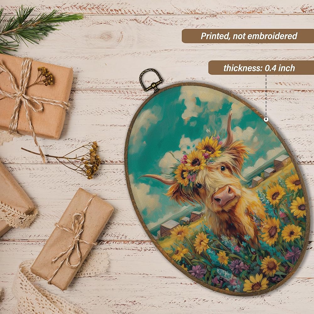 XBBMGG Highland Cow Sunflower Wall Art Decor, Rustic Farm Cow Floral Oval Wall Hanging Decor, Farmhouse Country Animal Framed Canvas Prints for Home Living Room Bedroom Decorations, 8.6x11.4inch
