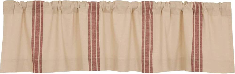 For this collection we chose a beautifully textured, substantial weight cotton with a surprisingly soft hand feel. The valance features four sets of broad woven stripes in muted brick red that run vertically on the valance, making a delightful contrast against the natural cream base. The valance is lined with white cotton and features no header, a 3.25″ rod pocket as well as fabric loops for an alternate hanging option. Valance measures 16″L x 72″W.