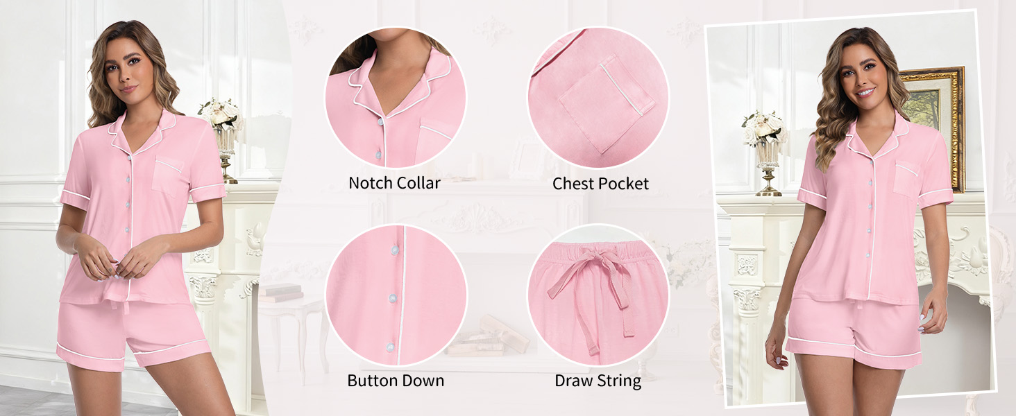 【Classic Design】This short-sleeve PJ set for women features a button-down front closure with a functional chest pocket and a notch collar design. The shorts come with an elastic waistband and an adjustable drawstring. This two-piece pajama set for women is easy to put on and take off, making it perfect for breastfeeding moms—just unbutton the top two buttons.