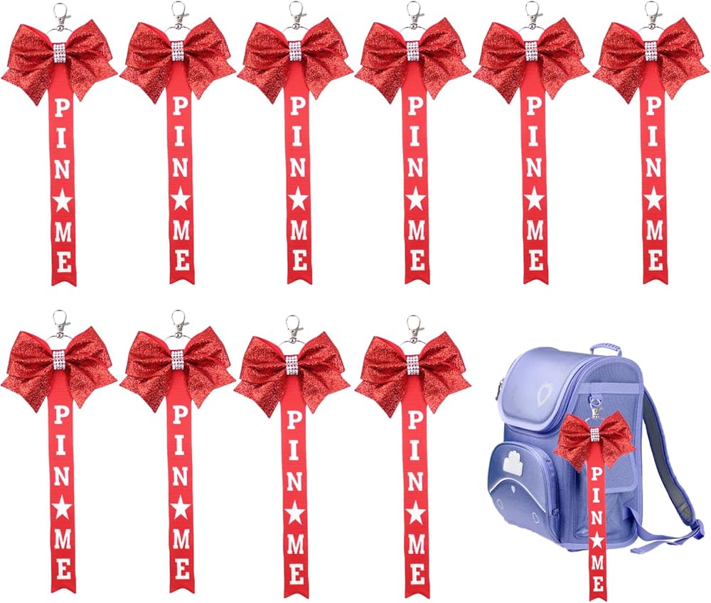 Cheer PIN ME Ribbon for Cheer Bags – Show off your cheer spirit with our 10 PCS set of "Pin Me" ribbon keychains. Each keychain is approximately 9.1 inches long, perfect for attaching to backpacks and collecting cheerleading pins. Adorned with glittering letters and a ribbon design, these keychains are the ideal accessory for any cheerleader.