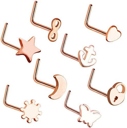 - PACKAGE CONTENTS: Set of 8 L-shaped nose studs featuring minimalist designs including heart, star, moon, and butterfly shapes