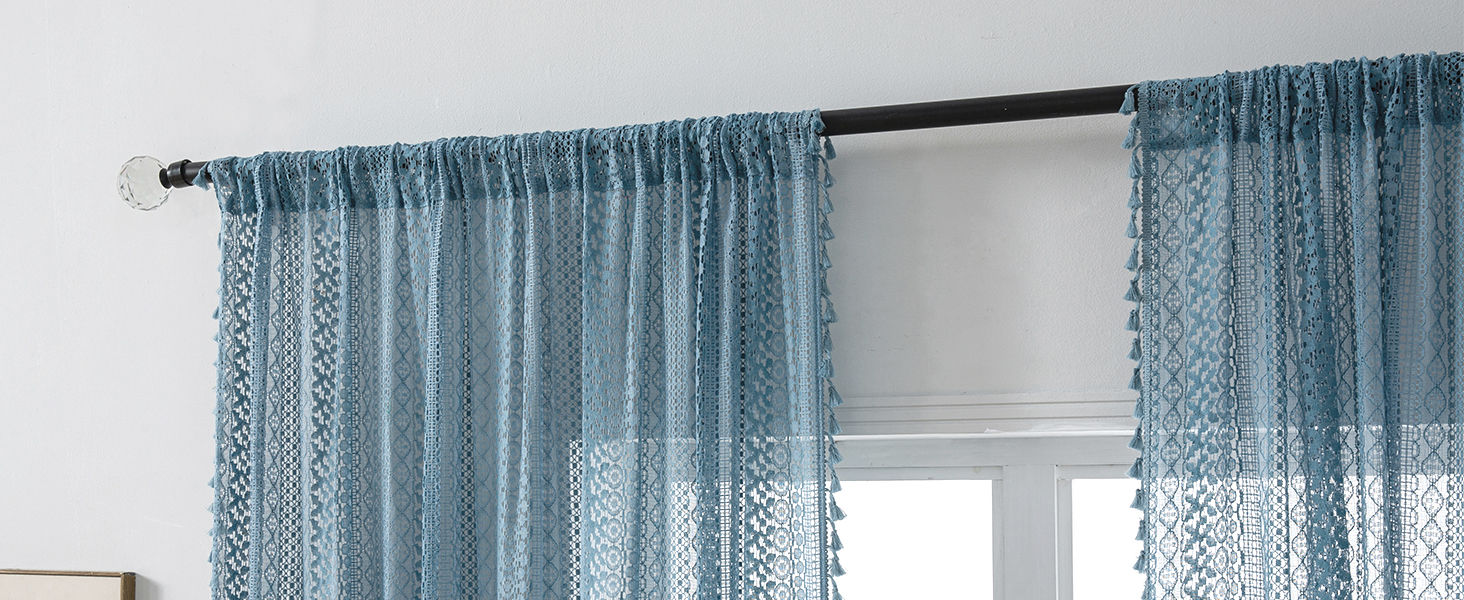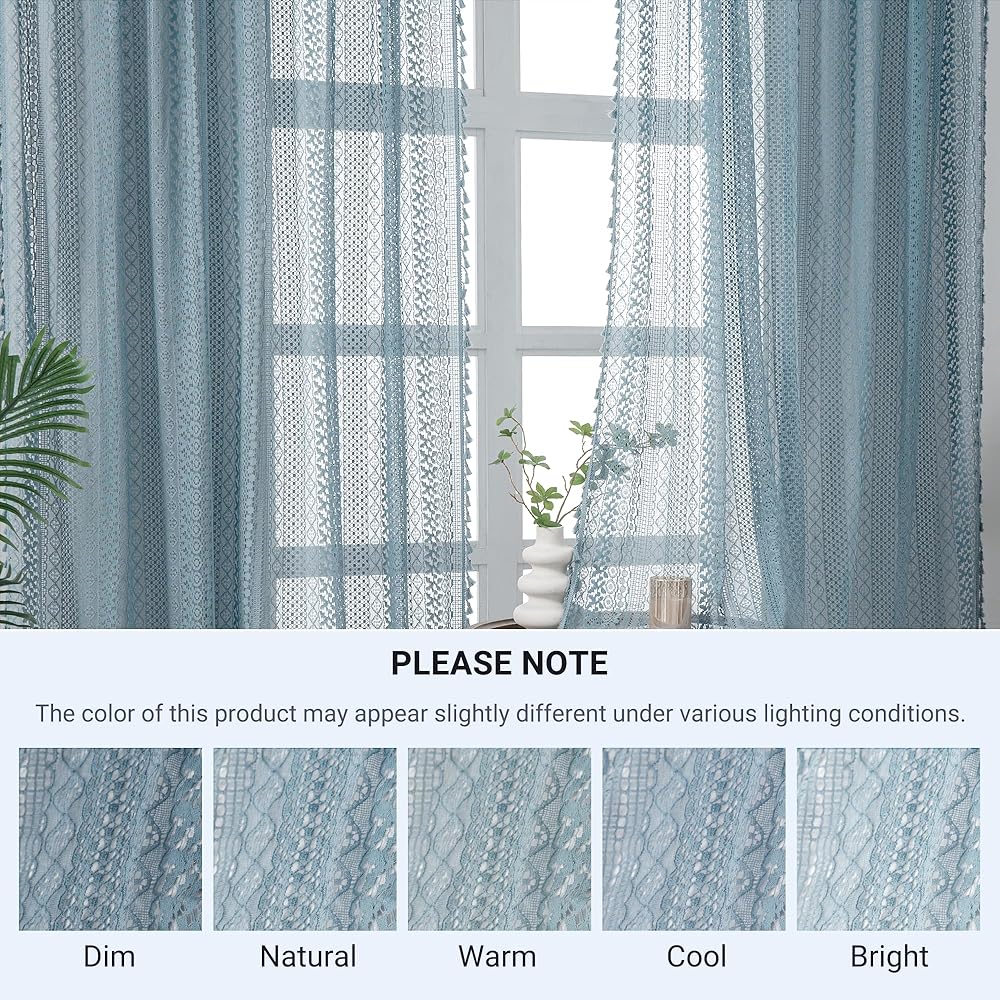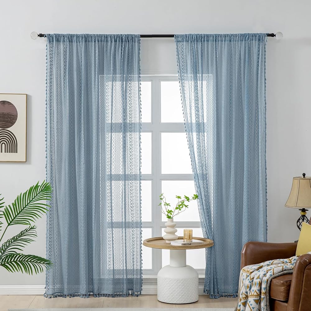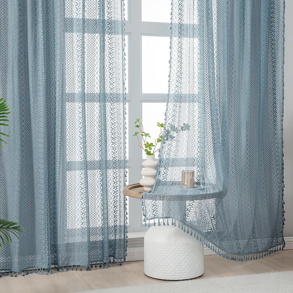 Light Blue Sheer Curtains 84 Inches Long 2 Panels Sheer Lace Pale Blue Curtains for Bedroom Living Room Rod Pocket Tassel Cotton Boho Crochet Curtains Light Filtering Privacy Drapes,Stone Blue