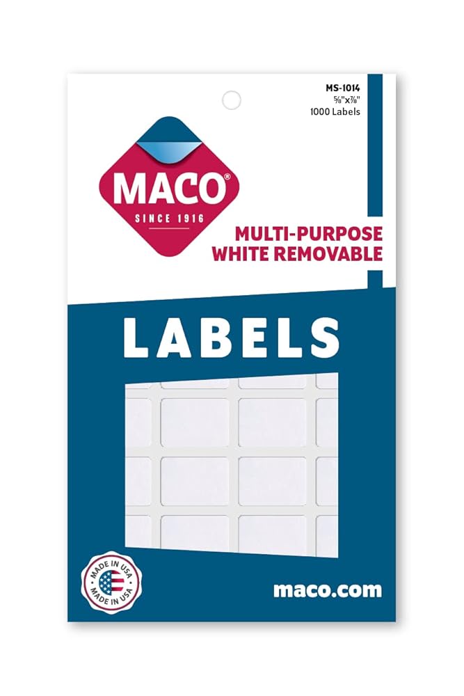 MACO White Rectangular Multi-Purpose Labels are perfect for a variety of uses including updating, organizing, marking, and more. The removable adhesive holds firmly, yet peels off easily. Proudly made in the USA. Label size: 5/8 x 7/8 inches. 1000 labels per box. MACO has been providing quality products to the business community since 1916. Their office products truly offer a blank canvas for creative business solutions.