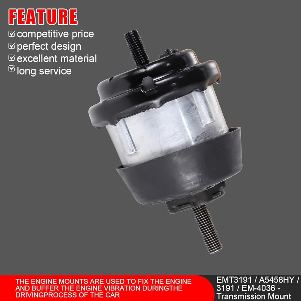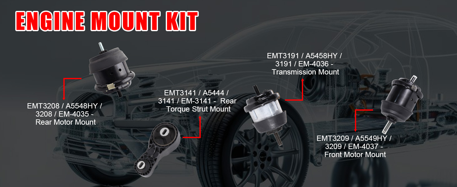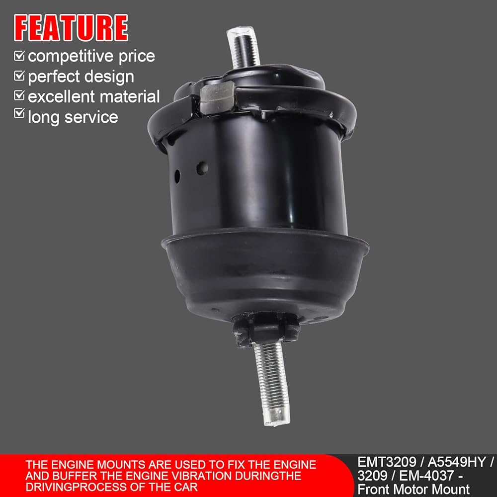 Package Included:1 x EMT3209 / A5549HY / 3209 / EM-4037 - Front Motor Mount ,1 x EMT3208 / A5548HY / 3208 / EM-4035 - Rear Motor Mount ,1 x EMT3191 / A5458HY / 3191 / EM-4036 - Transmission Mount ,1 x EMT3141 / A5444 / 3141 / EM-3141 - Rear Torque Strut Mount