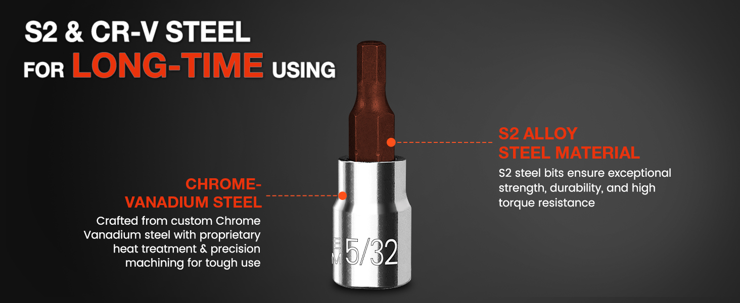 S2 & CR-V STEEL:Drop forged heat treated S2 alloy steel drill bits are directly pressed into the cr-v socket, which has high hardness and forms a permanent connection to reduce wear and ensure maximum durability