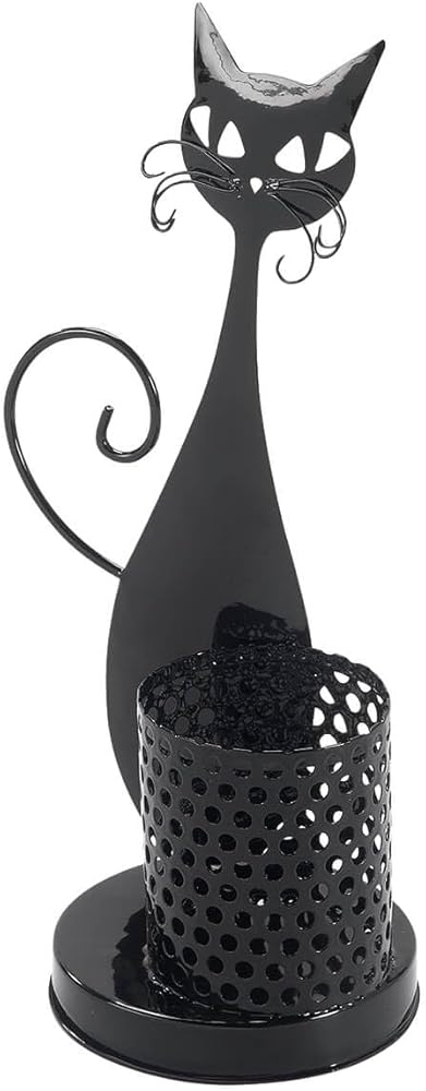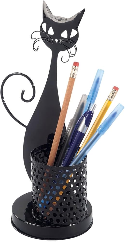 Organize your desk space with cool cat style that's a work of art! Retro-look black metal Cat Desk Pen Holder features a cute and content whiskered feline next to a cup that holds your pens, pencils, highlighters, scissors and more. Your supplies stay upright and within easy reach, all on a sturdy base. Desk organizer and pen stand measures 12" high x 10" dia. overall.