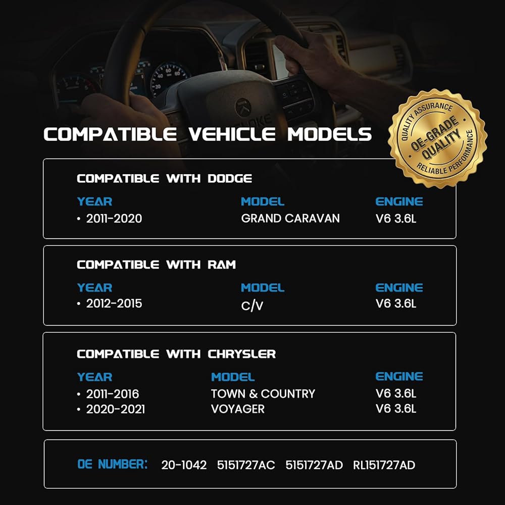 [Vehicle Fitment]: Compatible with Chrysler Town & Country 2011-2016 V6 3.6L, Voyager 2020-2021 V6 3.6L; Compatible with Dodge Grand Caravan 2011-2020 V6 3.6L; Compatible with Ram C/V 2012-2015 V6 3.6L.