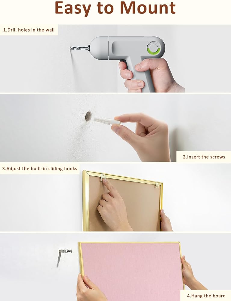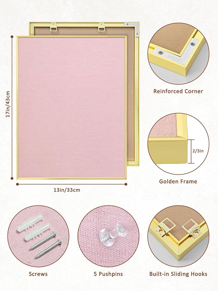 Multi-Functional Bulletin Board(17x13 inches): This bulletin board is made from fabric, and is framed with gold aluminum. The bulletin board is suitable for planning schedules, inspirations and chores organization. This pin board is suitable for pinning photos, menus, messages, weekly plan, memo, calendars, etc