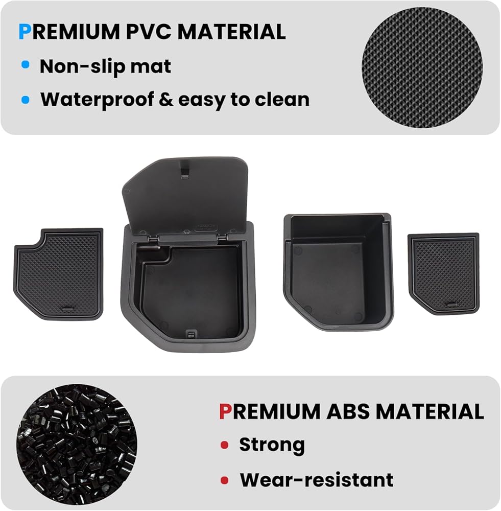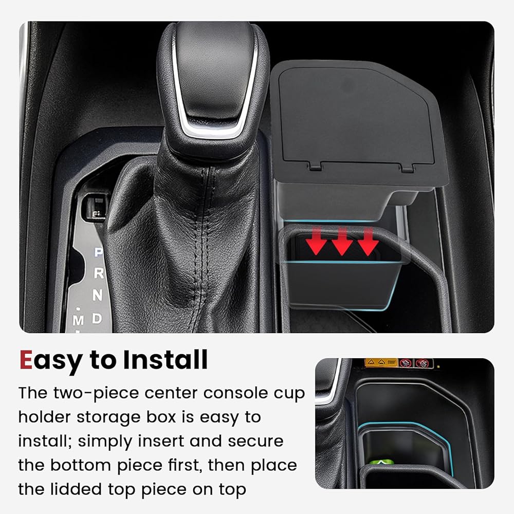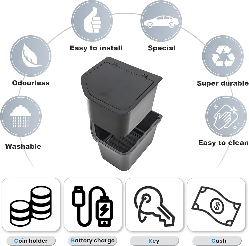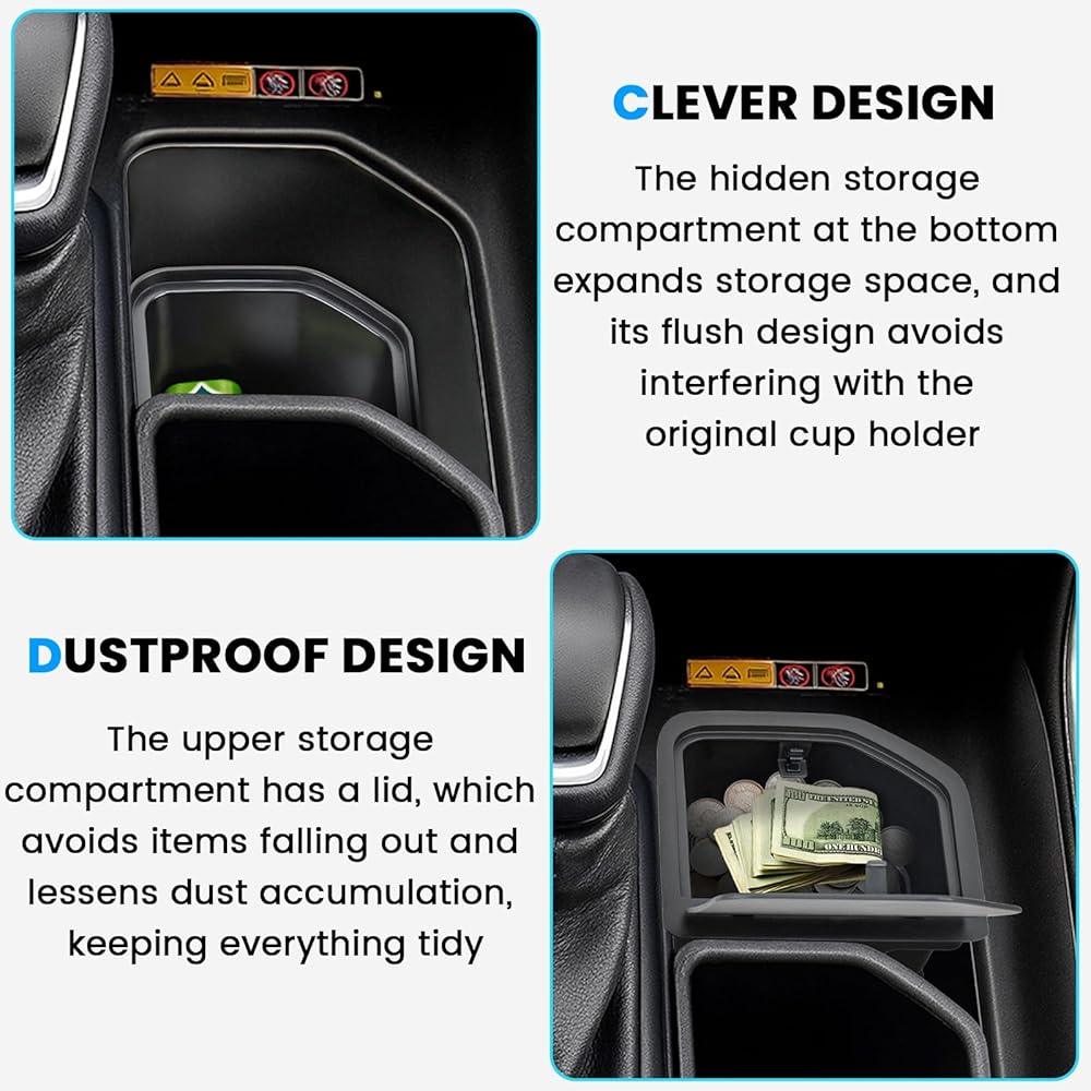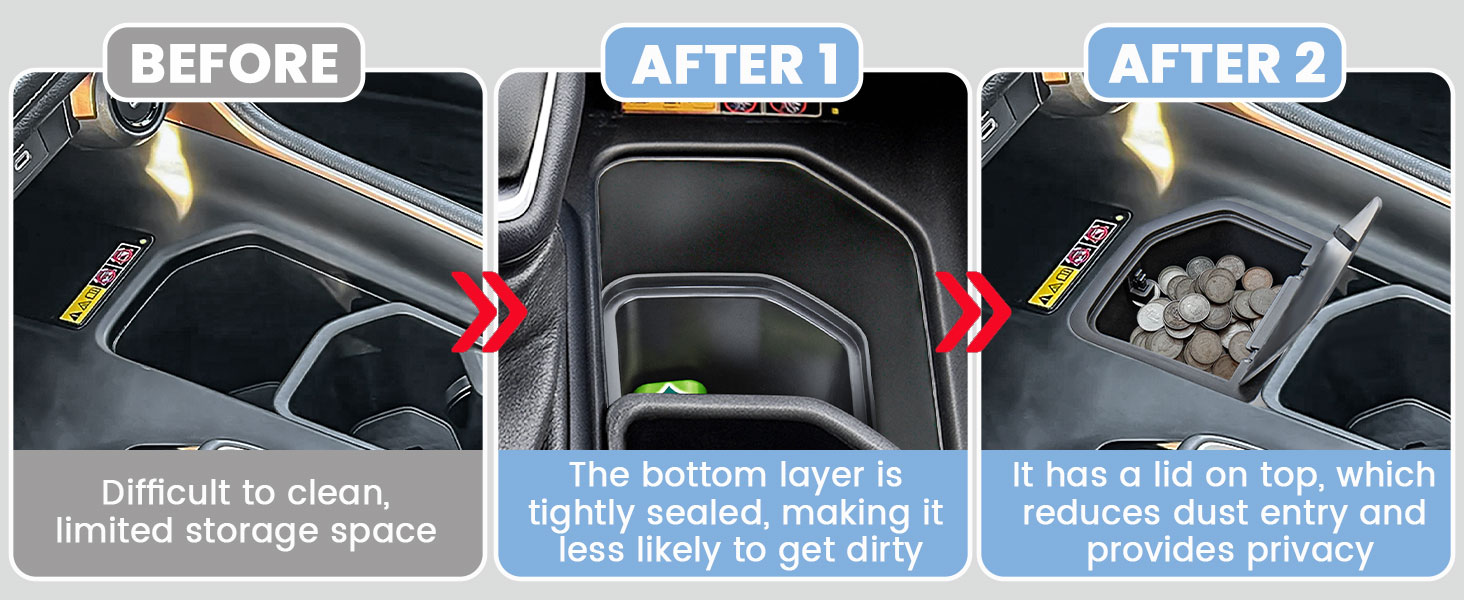 Easy Installation: The interior accessory set is easy to install—simply insert the top and bottom layers; The lower cup holder storage compartment helps keep your belongings out of sight, while the lid of the coin storage box reduces dust entry
