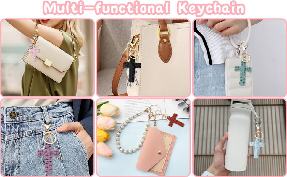 Versatile Styles - Our knit keychains Our knit keychains come in a variety of colors,such as pink,white,blue,green,red,black,and more,making them perfect accessories to embellish other items like backpacks,key rings,makeup bags.The macramé cross keychain will make your outfits increasingly stylish.It can also let others see your beliefs at a glance.