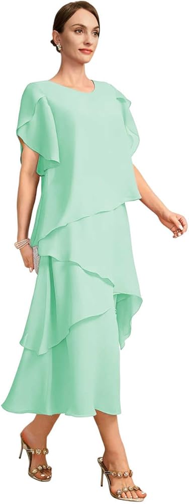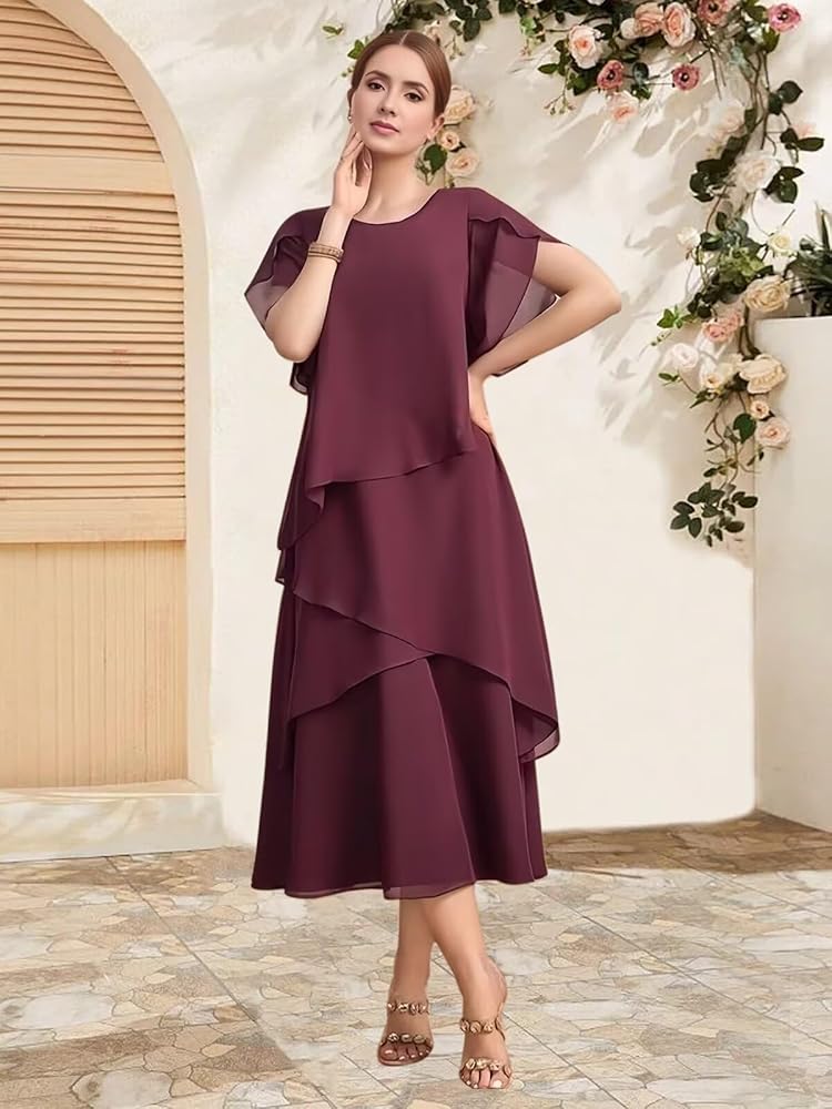 Features: A modest fashionable Chiffon a line mother of the brides dresses with scoop neckline and flutter sleeves. The relaxed sheath skirt has a multi layer tier effect which elongates your silhouette.