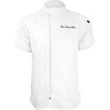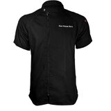 ChefsCloset Personalized Jamison Men's Short Sleeve Chef Coat – Embroidered Chef Jacket with Offset Zipper and Mesh Panels. Custom Embroidery Option – Personalize your coat with your name or custom text for a professional, signature look that sets you apart in any kitchen. Modern Men's Fit for Comfort and Mobility – Designed for professional chefs, this men's coat provides a clean, structured fit with excellent range of motion and all-day comfort in fast-paced kitchens. Durable 65/35 Easy-Care Poplin Fabric – Lightweight, wrinkle-resistant, and breathable cotton-poly blend that stays crisp and easy to maintain through long shifts and repeated washing. Ventilated Mesh Panels for Cooling Airflow – Short sleeves and mesh inserts at the sleeves, sides, and upper back promote airflow to help you stay cool and dry in hot kitchen environments. Contemporary Zipper Front and Utility Pocket – Modern offset zipper closure with collar snap for a sleek look, plus a sleeve pocket for thermometers and markers.