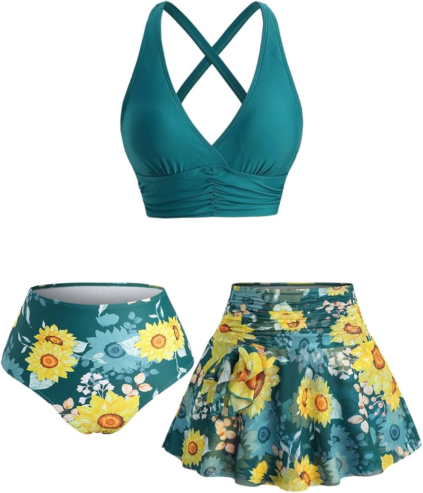 Alluring 3-Piece Vintage Set: Discover your perfect summer style with this complete 3-piece bikini set! Featuring a stunning vintage sunflower print, this unique collection includes a tankini top, high-waisted bottoms, and a matching bandeau. Enjoy the freedom to mix and match for multiple gorgeous, retro-inspired looks by the pool or on the beach.