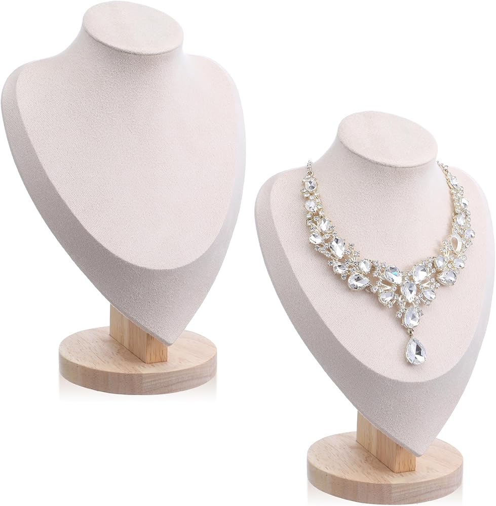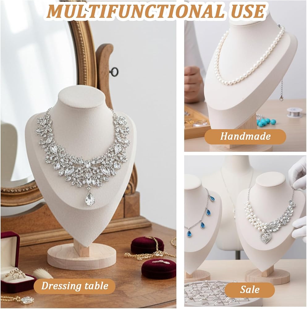 These beige necklace display stands are designed to showcase your jewelry with elegance and practicality. Made from durable bamboo and soft velvet, they provide a sturdy and attractive base for necklaces, and other accessories. Ideal for home use, retail stores, trade shows, or photography, these stands help organize and highlight your jewelry collection in a stylish manner. The neutral beige color complements any décor, while the functional hook design allows for easy adjustments and secure display.