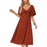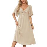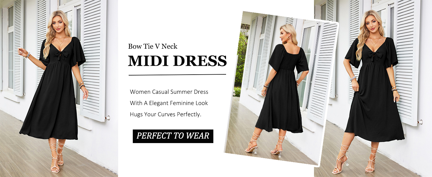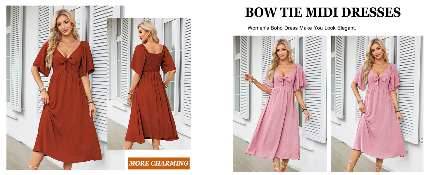 DESIGN: Add A Touch of Femininity to This Midi Dress with Charming Tie Front Detail, Allowing You to Adjust The Fit and Create A Flattering Silhouette. Enhance Your Style with Stylish V-shaped Neckline That Brings Attention to Your Upper Body, Women's Boho Dress Make You Look Elegant. This Swing A-line Dress with Back Smocked Feature, Offering A Snug and Comfortable Fit That Hugs Your Curves.