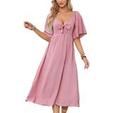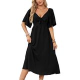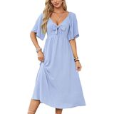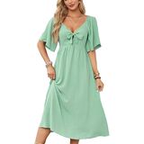 Womens Summer Casual Short Sleeve Bow Tie V Neck Ruffle Smocked Flowy Midi Dresses