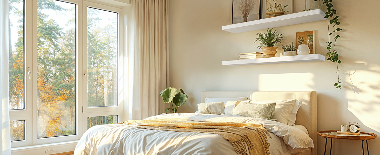 Wood Floating Shelves: Each wall shelf measures 6.7"D x 23.6"W x 1.2"H and offers more space to store more items.