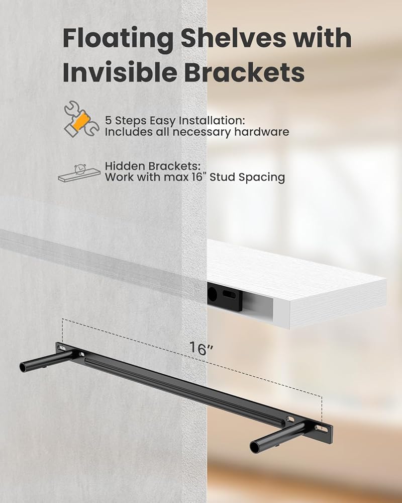 Invisible & Sturdy Metal Brackets: Enhanced metal brackets matched with precisely made screws will affix the floating shelves on the wall firmly without sliding or swaying.
