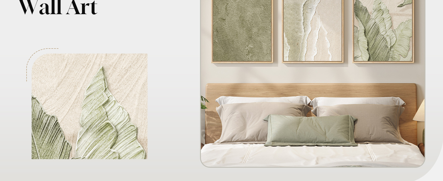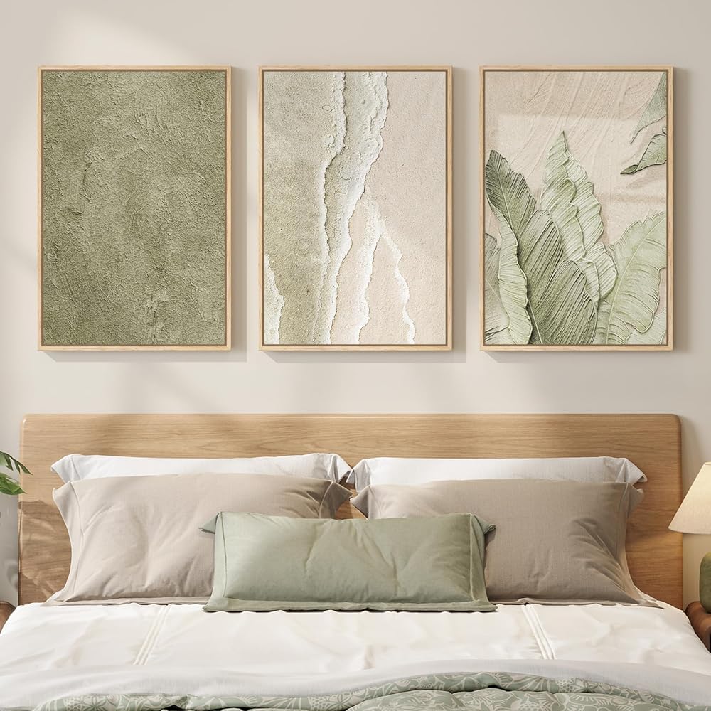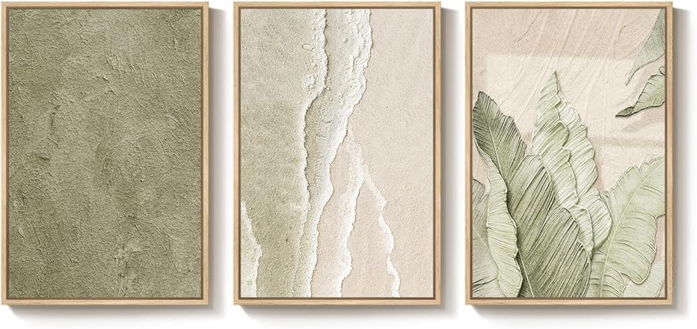 [Premium Canvas and Wood Frame]: Printed on high quality, fade resistant canvas to enhance beach waves and botanical leaf detail. Dust‑protected and treated to resist fading, so the sage green stays fresh over time. The sturdy wood frame adds a clean look and reliable support for years of hanging