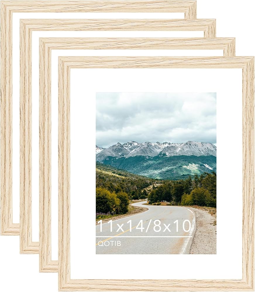 11x14 Wood Picture Frame with 8x10 Mat, Display 8x10 with Mat or 11x14 Without Mat, Wooden 11 by 14 Photo Frame, 11 x 14 Frame for Wall Hanging Display, Natural Beige, 4 Pack