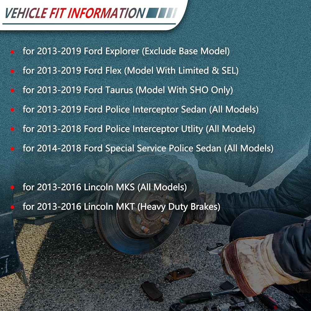 COMPATIBLITY- Front Rear Brake Pads For 2013-2019 Ford Explorer; For 2013-2019 Ford Flex ; For 2013-2019 Ford Taurus; For 2013-2019 Ford Police Interceptor Sedan ; For 2013-2018 Ford Police Interceptor Utlity ; For 2014-2018 Ford Special Service Police Sedan