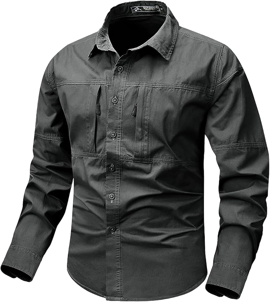 【Tactical Design】This tactical shirt zippered chest pockets enable quick-access storage of essentials like keys/phone/tools, the button-front closure with a collar offers versatile styling , and reinforced seams ensure rugged durability for heavy-duty use