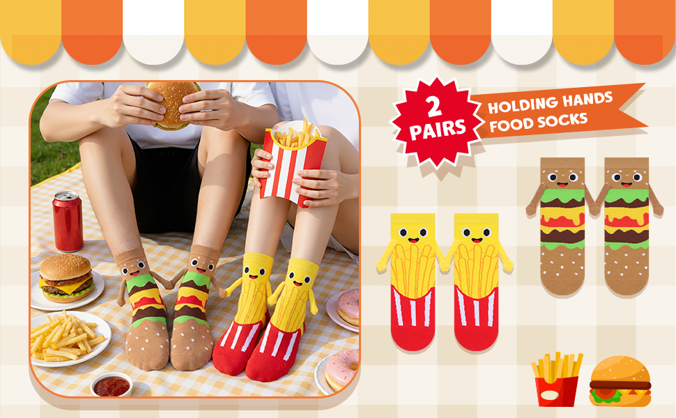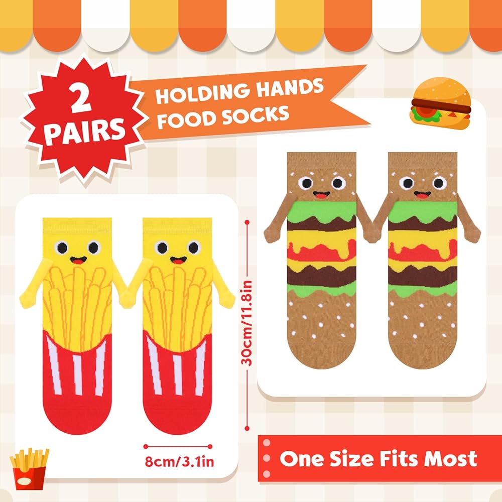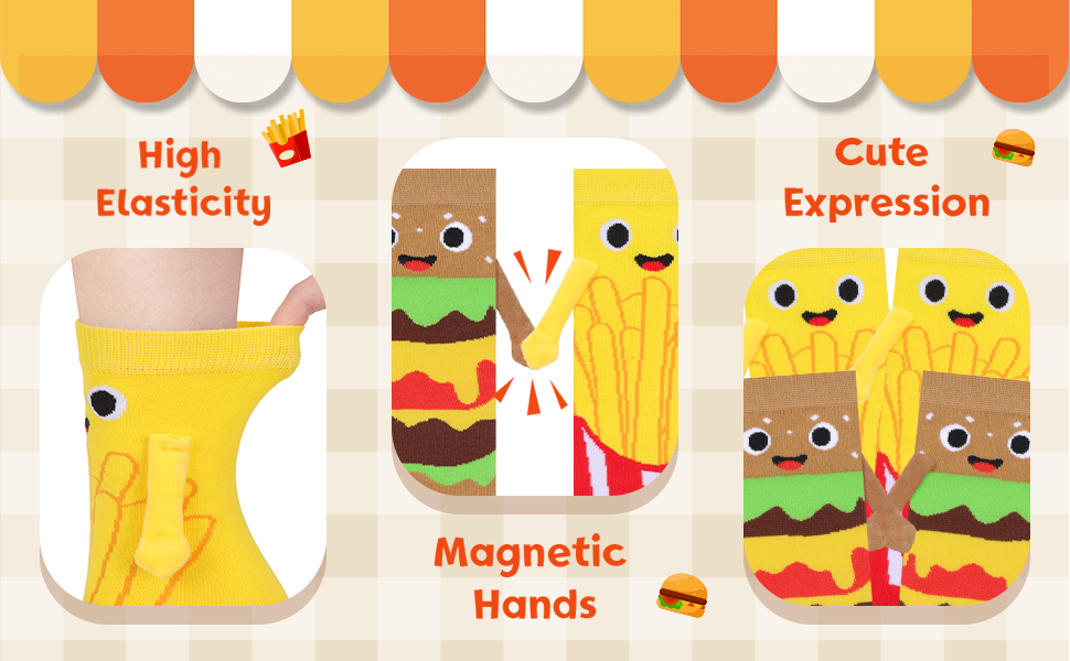 Fun & Playful Food Characters: This 2-pack of magnetic socks features fries and burgers as complete food characters, rather than just simple graphic prints. From the color scheme and expressions to the extended forearms, every detail emphasizes that "they are an interactive pair." Wearing them feels like having two happy little friends on your feet, naturally becoming the visual focus of your entire outfit