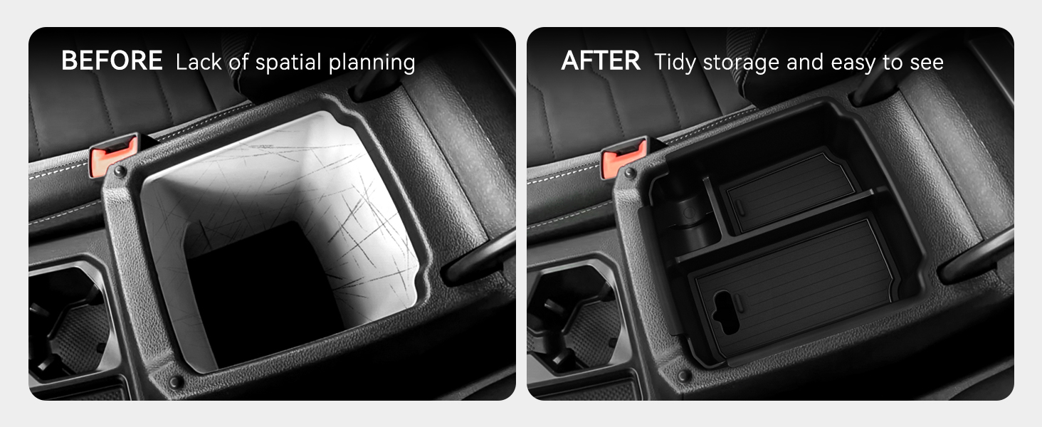 【Increase storage space】: Sunglasses, tissues, keys, cell phones and other small items can be placed on the storage tray for easy access, making the armrest storage box much more functional