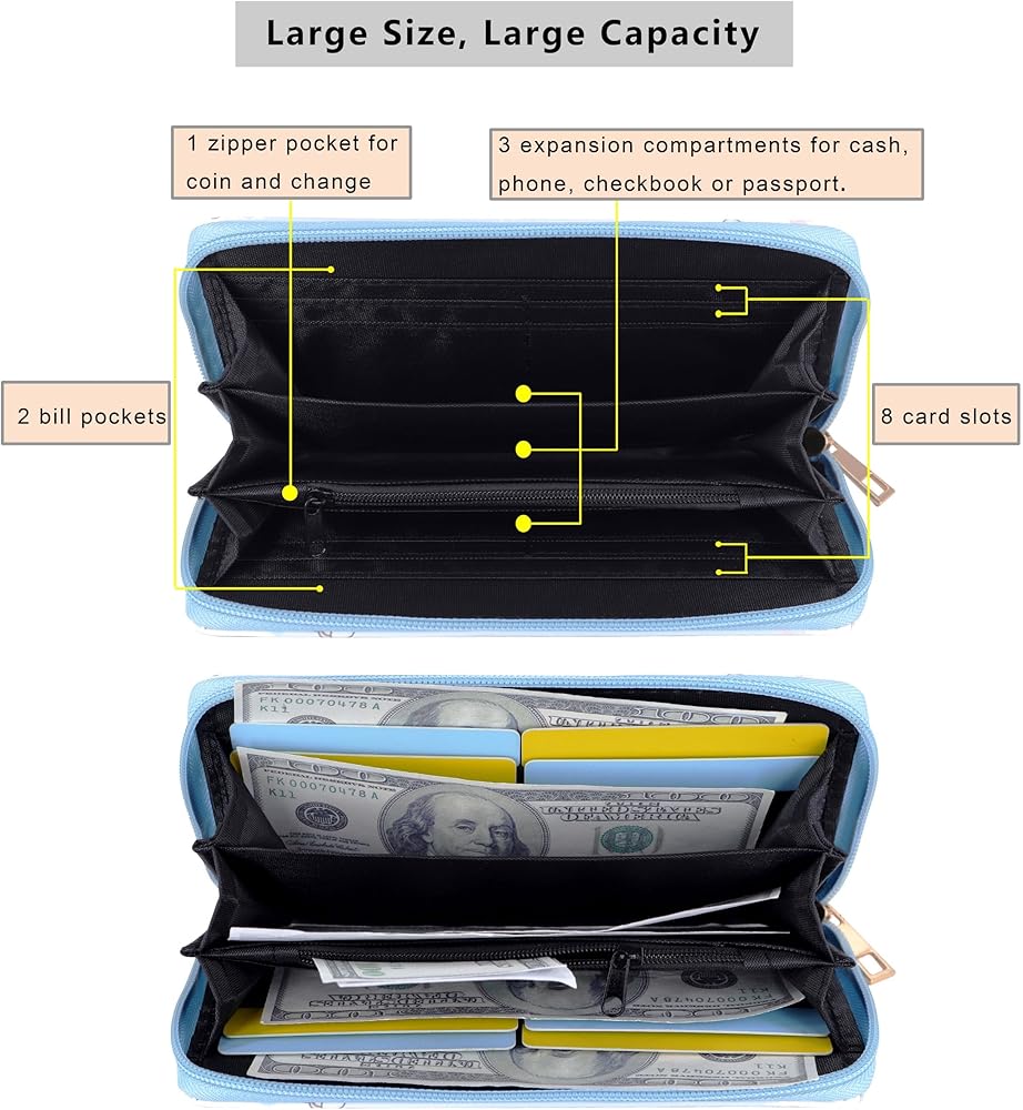 - ⭐️Function Design: Inner: 8 card slots,1 zipper pocket for coin and change, 2 open bill compartments, 3 expansion pocket for cash,checkbook or phone.