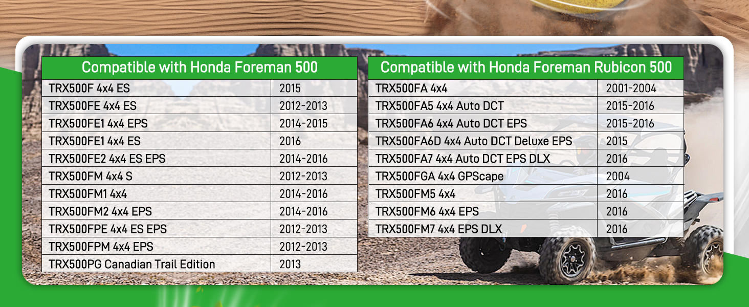 - Fit for Honda Foreman 500: Compatible with TRX500F 4x4 ES (2015), TRX500FE 4x4 ES (2012-2013), TRX500FE1 4x4 EPS (2014-2015), TRX500FE1 4x4 ES (2016), TRX500FE2 4x4 ES EPS (2014-2016), TRX500FM 4x4 S (2012-2013), TRX500FM1 4x4 (2014-2016), TRX500FM2 4x4 EPS (2014-2016), TRX500FPE 4x4 ES EPS (2012-2013), TRX500FPM 4x4 EPS (2012-2013), TRX500PG Canadian Trail Edition (2013).