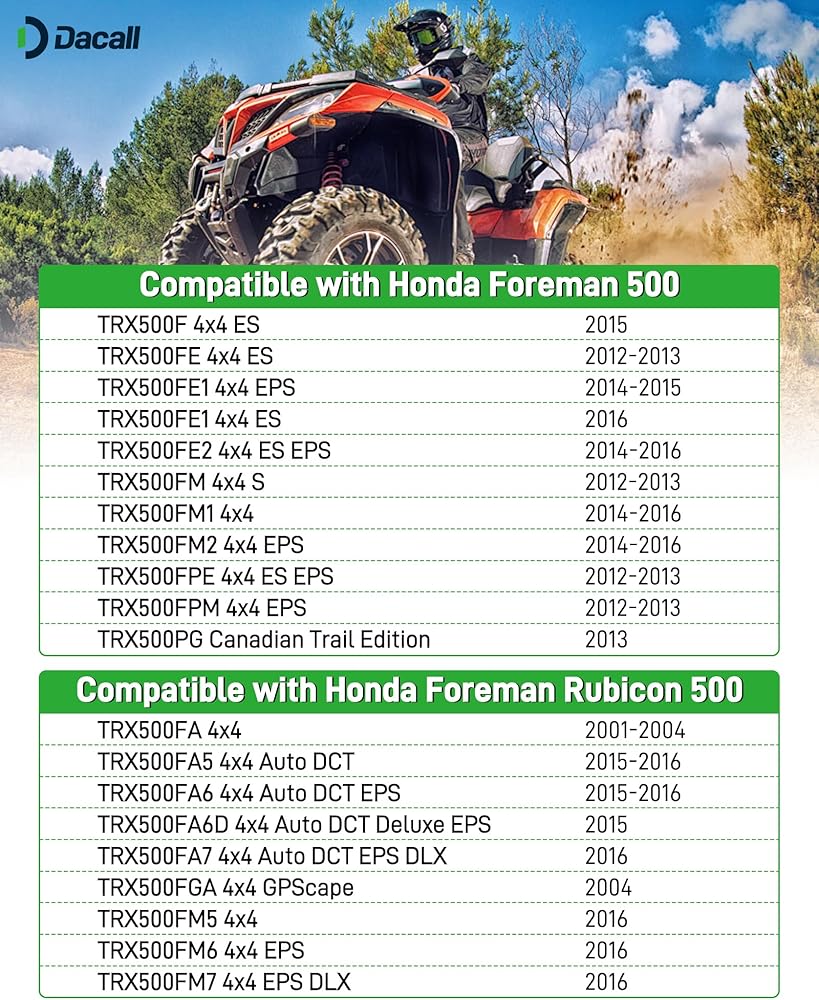 - Fit for Honda Foreman Rubicon 500: Compatible with TRX500FA 4x4 (2001-2004), TRX500FA5 4x4 Auto DCT (2015-2016), TRX500FA6 4x4 Auto DCT EPS (2015-2016), TRX500FA6D 4x4 Auto DCT Deluxe EPS (2015), TRX500FA7 4x4 Auto DCT EPS DLX (2016), TRX500FGA 4x4 GPScape (2004), TRX500FM5 4x4 (2016), TRX500FM6 4x4 EPS (2016),TRX500FM7 4x4 EPS DLX (2016).